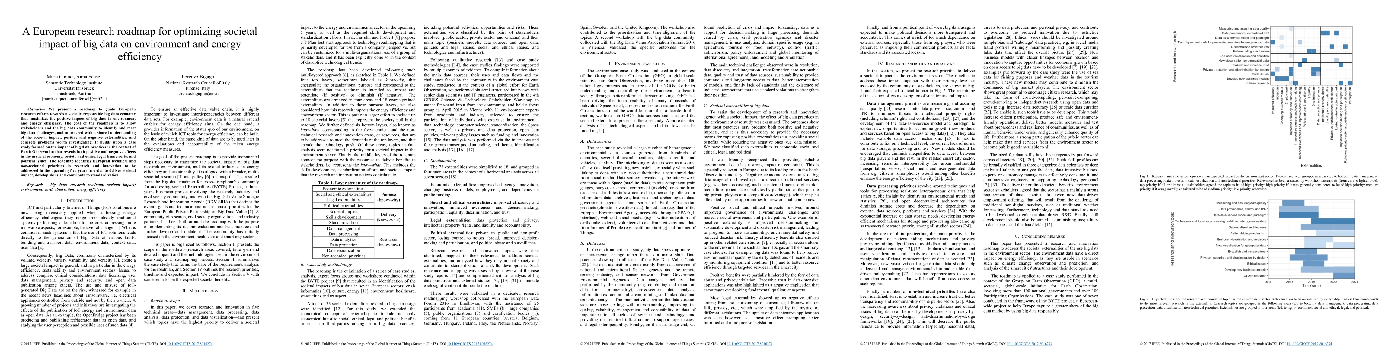 This research paper outlines a roadmap for European research to optimize the societal impact of big data on environment and energy efficiency, emphasizing a socially responsible approach. It identifies technical and non-technical priorities to address over the next five years, aiming to maximize benefits while mitigating negative externalities.