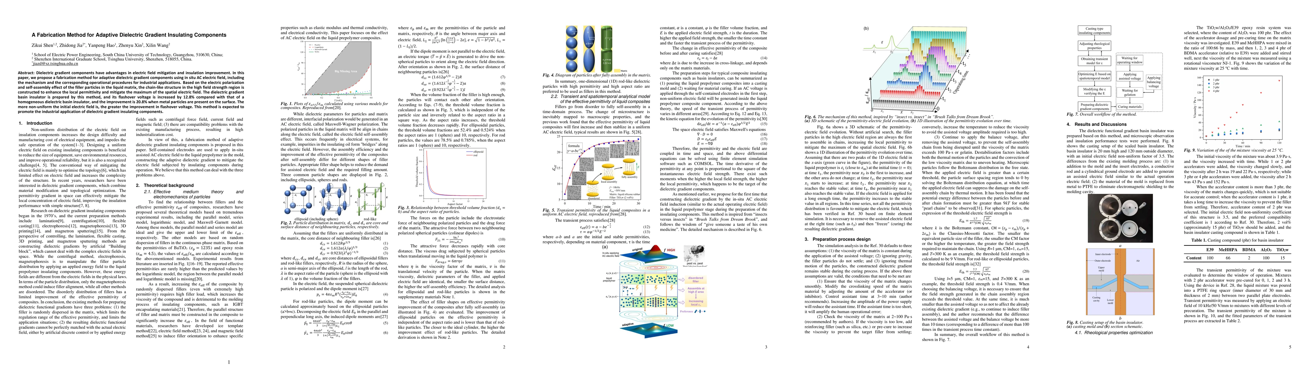 Dielectric gradient components have advantages in electric field mitigation and insulation improvement. In this paper, we propose a fabrication method for adaptive dielectric gradient components using in situ AC electric field, including the mechanism and the corresponding operational procedures for industrial applications. Based on the electric polarization and self-assembly effect of the filler particles in the liquid matrix, the chain-like structure in the high field strength region is constructed to enhance the local permittivity and mitigate the maximum of the spatial electric field. The dielectric gradient basin insulator is prepared by this method, and its flashover voltage is increased by 12.8% compared with that of a homogeneous dielectric basin insulator, and the improvement is 20.8% when metal particles are present on the surface. The more non-uniform the initial electric field is, the greater the improvement in flashover voltage. This method is expected to promote the industrial application of dielectric gradient insulating components.