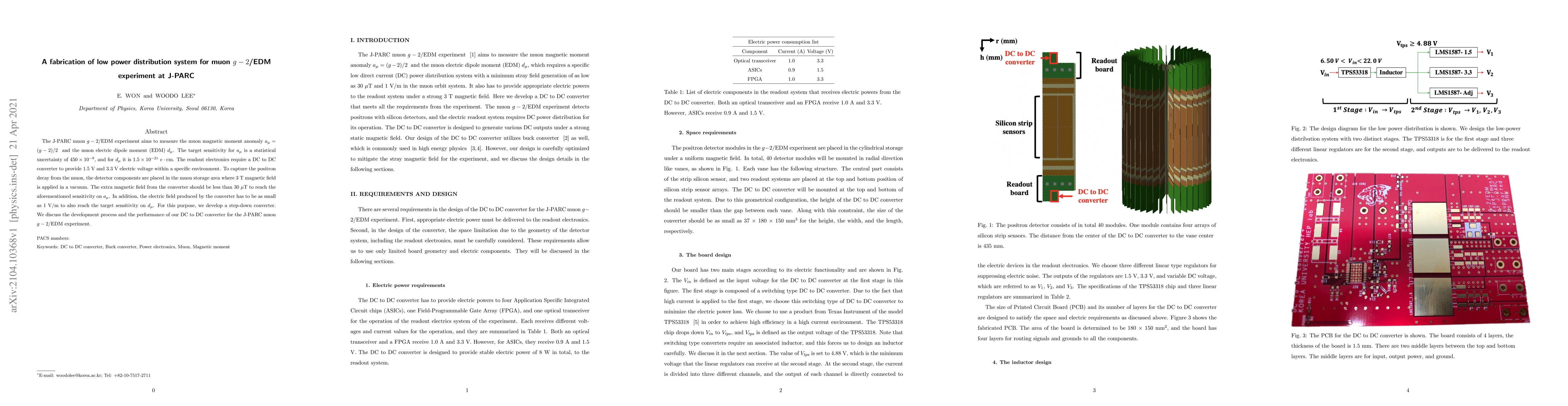This paper details the design and development of a low power DC to DC converter for the J-PARC muon $g-2$/EDM experiment, aiming to achieve high sensitivity measurements for the muon magnetic moment anomaly and electric dipole moment. The converter must generate 1.5 V and 3.3 V voltages with minimal magnetic and electric field interference to meet the stringent experimental requirements.