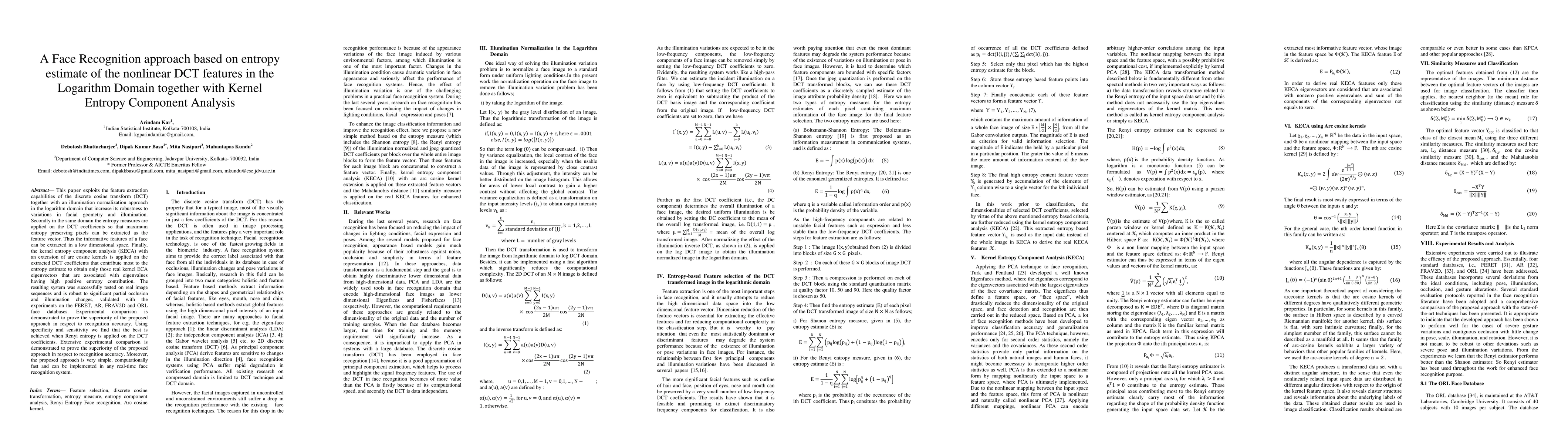 This paper exploits the feature extraction capabilities of the discrete cosine transform (DCT) together with an illumination normalization approach in the logarithm domain that increase its robustness to variations in facial geometry and illumination. Secondly in the same domain the entropy measures are applied on the DCT coefficients so that maximum entropy preserving pixels can be extracted as the feature vector. Thus the informative features of a face can be extracted in a low dimensional space. Finally, the kernel entropy component analysis (KECA) with an extension of arc cosine kernels is applied on the extracted DCT coefficients that contribute most to the entropy estimate to obtain only those real kernel ECA eigenvectors that are associated with eigenvalues having high positive entropy contribution. The resulting system was successfully tested on real image sequences and is robust to significant partial occlusion and illumination changes, validated with the experiments on the FERET, AR, FRAV2D and ORL face databases. Experimental comparison is demonstrated to prove the superiority of the proposed approach in respect to recognition accuracy. Using specificity and sensitivity we find that the best is achieved when Renyi entropy is applied on the DCT coefficients. Extensive experimental comparison is demonstrated to prove the superiority of the proposed approach in respect to recognition accuracy. Moreover, the proposed approach is very simple, computationally fast and can be implemented in any real-time face recognition system.