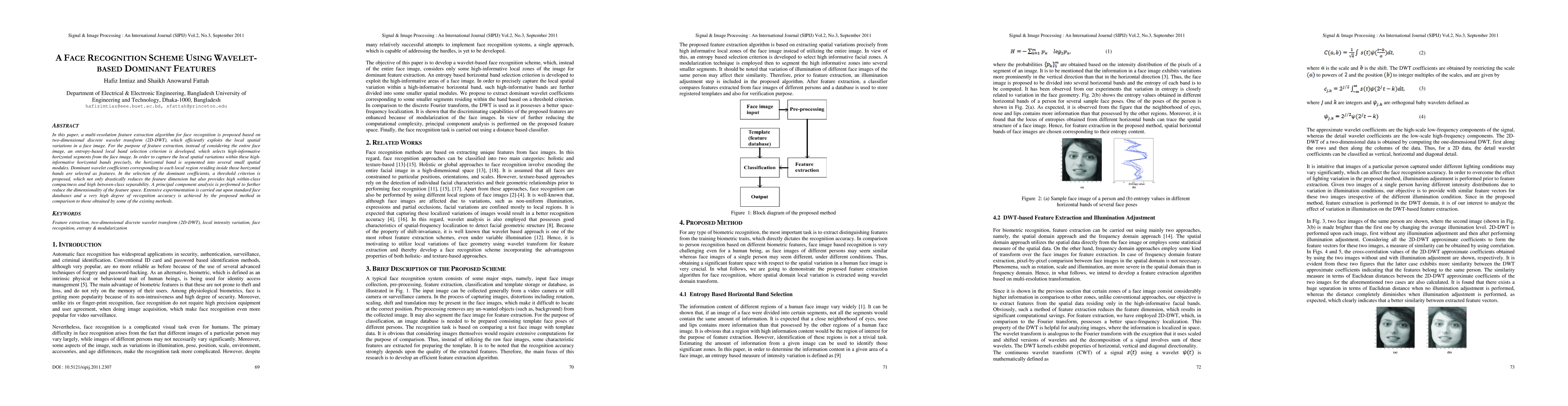 In this paper, a multi-resolution feature extraction algorithm for face recognition is proposed based on two-dimensional discrete wavelet transform (2D-DWT), which efficiently exploits the local spatial variations in a face image. For the purpose of feature extraction, instead of considering the entire face image, an entropy-based local band selection criterion is developed, which selects high-informative horizontal segments from the face image. In order to capture the local spatial variations within these highinformative horizontal bands precisely, the horizontal band is segmented into several small spatial modules. Dominant wavelet coefficients corresponding to each local region residing inside those horizontal bands are selected as features. In the selection of the dominant coefficients, a threshold criterion is proposed, which not only drastically reduces the feature dimension but also provides high within-class compactness and high between-class separability. A principal component analysis is performed to further reduce the dimensionality of the feature space. Extensive experimentation is carried out upon standard face databases and a very high degree of recognition accuracy is achieved by the proposed method in comparison to those obtained by some of the existing methods.