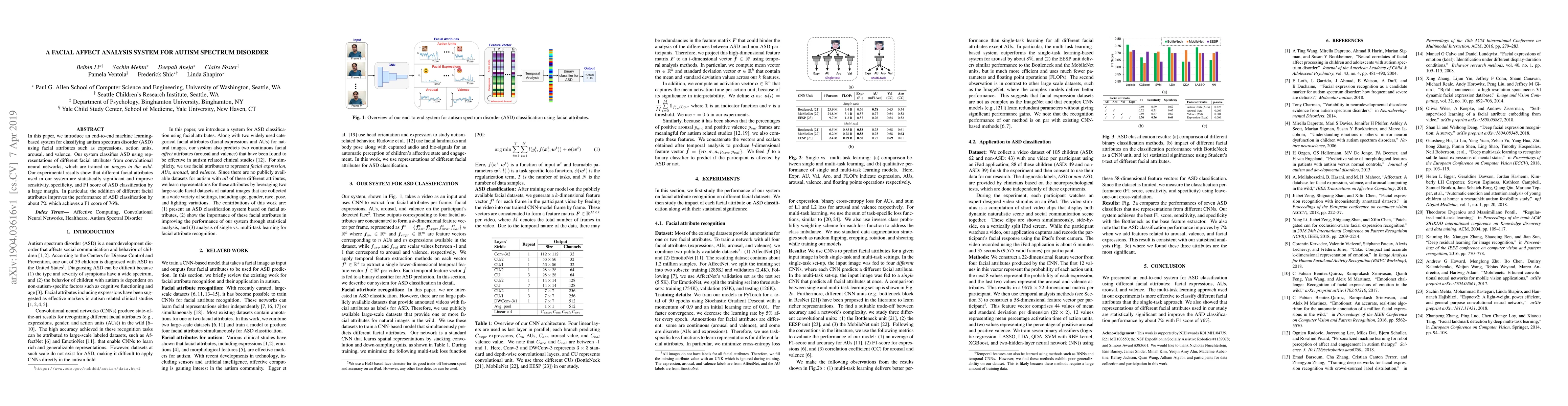 In this paper, we introduce an end-to-end machine learning-based system for classifying autism spectrum disorder (ASD) using facial attributes such as expressions, action units, arousal, and valence. Our system classifies ASD using representations of different facial attributes from convolutional neural networks, which are trained on images in the wild. Our experimental results show that different facial attributes used in our system are statistically significant and improve sensitivity, specificity, and F1 score of ASD classification by a large margin. In particular, the addition of different facial attributes improves the performance of ASD classification by about 7% which achieves a F1 score of 76%.