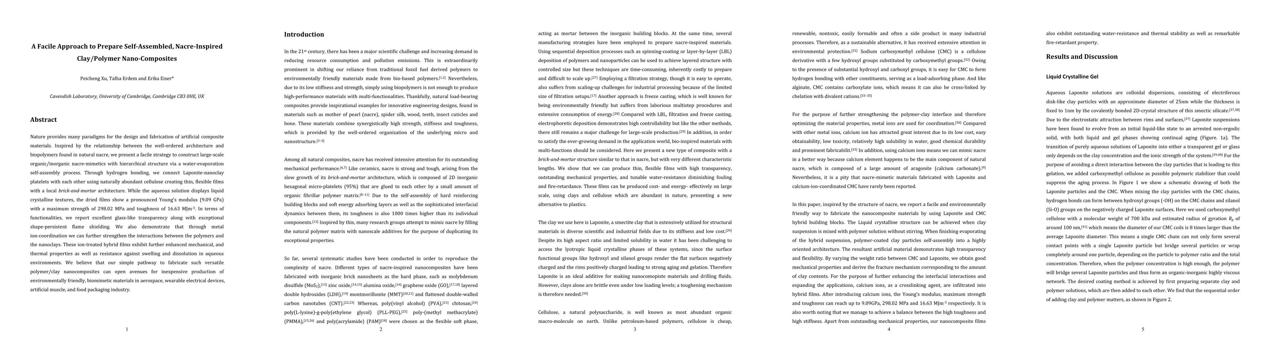 Nature provides many paradigms for the design and fabrication of artificial composite materials. Inspired by the relationship between the well-ordered architecture and biopolymers found in natural nacre, we present a facile strategy to construct large-scale organic/inorganic nacre-mimetics with hierarchical structure via a water-evaporation self-assembly process. Through hydrogen bonding, we connect Laponite-nanoclay platelets with each other using naturally abundant cellulose creating thin, flexible films with a local brick-and-mortar architecture. While the aqueous solution displays liquid crystalline textures, the dried films show a pronounced Young's modulus (9.09 GPa) with a maximum strength of 298.02 MPa and toughness of 16.63 MJm-3. In terms of functionalities, we report excellent glass-like transparency along with exceptional shape-persistent flame shielding. We also demonstrate that through metal ion-coordination we can further strengthen the interactions between the polymers and the nanoclays. These ion-treated hybrid films exhibit further enhanced mechanical, and thermal properties as well as resistance against swelling and dissolution in aqueous environments. We believe that our simple pathway to fabricate such versatile polymer/clay nanocomposites can open avenues for inexpensive production of environmentally friendly, biomimetic materials in aerospace, wearable electrical devices, artificial muscle, and food packaging industry.