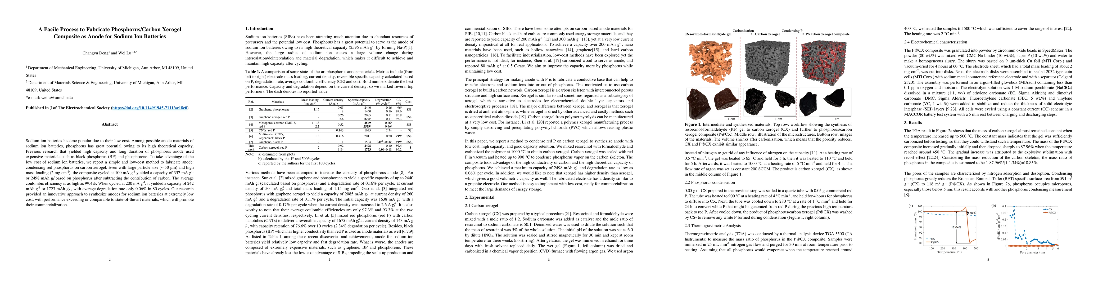 This paper presents a simple, low-cost method to fabricate a phosphorus/carbon xerogel composite anode for sodium ion batteries, achieving high capacity (357 mA h g$^{-1}$) and excellent coulombic efficiency (99.4%). The composite maintains stable performance with minimal degradation (0.06% over 80 cycles), offering a cost-effective alternative to expensive materials.