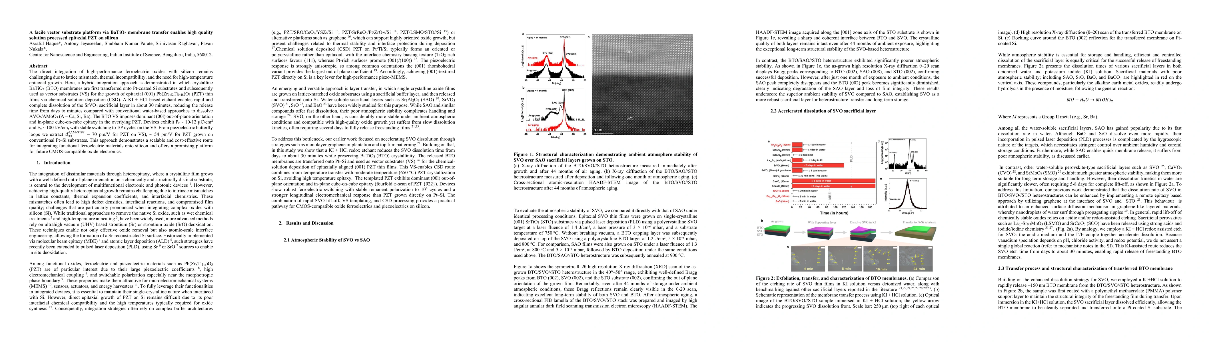 The direct integration of high-performance ferroelectric oxides with silicon remains challenging due to lattice mismatch, thermal incompatibility, and the need for high-temperature epitaxial growth. Here, a hybrid integration approach is demonstrated in which crystalline BaTiO3 (BTO) membranes are first transferred onto Pt coated Si substrates and subsequently used as vector substrates (VS) for the growth of epitaxial (001) Pb(Zr0.52Ti0.48)O3 (PZT) thin films via chemical solution deposition (CSD). A KI and HCl based etchant enables rapid and complete dissolution of the SrVO3 sacrificial layer in about 30 minutes, reducing the release time from days to minutes compared with conventional water based approaches to dissolve AVO3 and AMoO3 (A is Ca, Sr, Ba). The BTO VS imposes dominant (00l) out of plane orientation and in plane cube on cube epitaxy in the overlying PZT. Devices exhibit remnant polarization 10 to 12 micro coulomb/cm2 and coercive field of 100 kV/cm, with stable switching to 10^8 cycles on the VS. From piezoelectric butterfly loops, we extract effective d33 of 70 pm/V for PZT on VS, and 54 pm/V for PZT grown on conventional Pt Si substrates. This approach demonstrates a scalable and cost effective route for integrating functional ferroelectric materials onto silicon and offers a promising platform for future CMOS compatible oxide electronics.