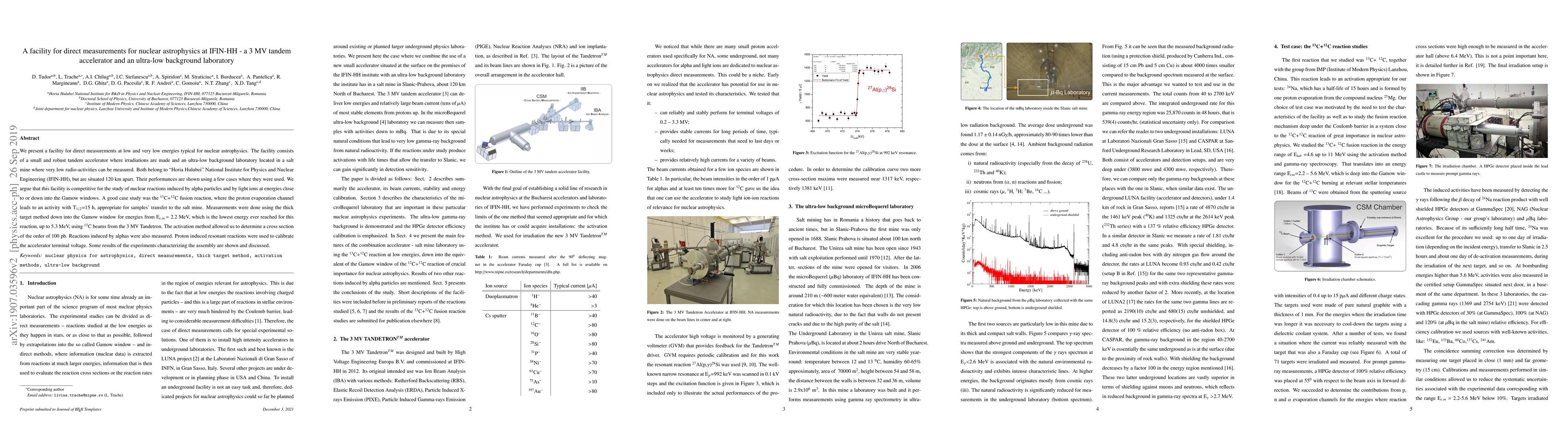 This paper introduces a nuclear astrophysics facility at IFIN-HH, featuring a 3 MV tandem accelerator and an ultra-low background laboratory in a salt mine. The facility enables direct measurements of nuclear reactions at low energies, exemplified by the 13C+12C fusion reaction, achieving unprecedented low energies and cross-section determinations.