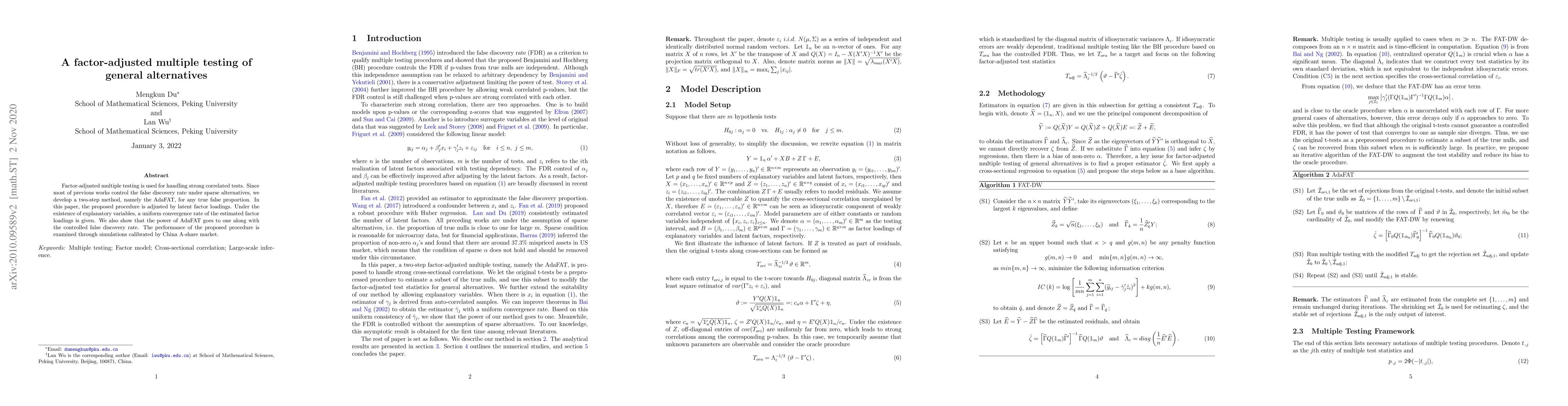 This paper introduces AdaFAT, a factor-adjusted multiple testing method for correlated tests, which controls the false discovery rate under general alternatives. The proposed two-step procedure leverages latent factor loadings, demonstrating improved power and controlled false discovery rate through simulations based on China A-share market data.
