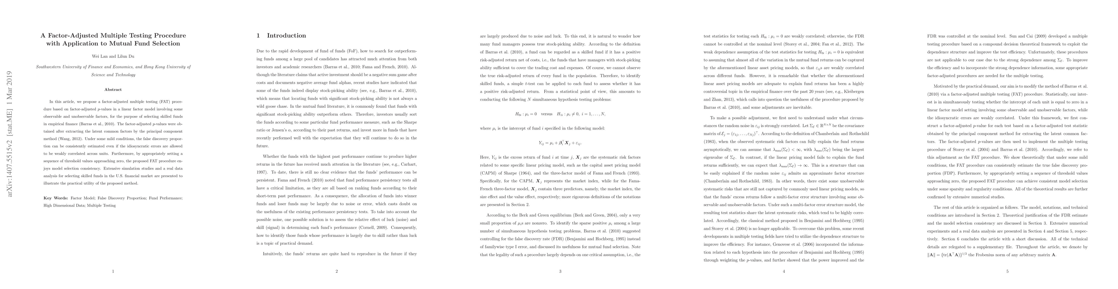 This paper proposes a factor-adjusted multiple testing (FAT) procedure to select skilled mutual funds by adjusting p-values for observable and unobservable factors using a linear factor model. The method demonstrates consistent estimation of the false discovery proportion and model selection consistency under mild conditions.