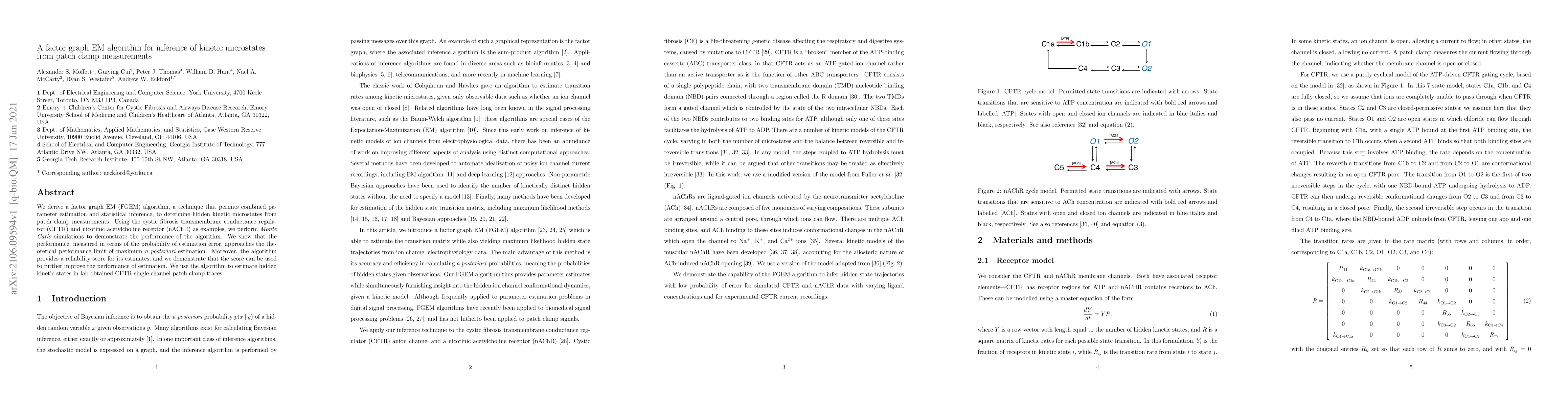 The paper introduces a factor graph EM (FGEM) algorithm for inferring kinetic microstates from patch clamp measurements, demonstrating its effectiveness through simulations and real data from CFTR and nAChR channels. The FGEM algorithm achieves near-optimal estimation accuracy and provides a reliability score for its estimates, enhancing overall performance.