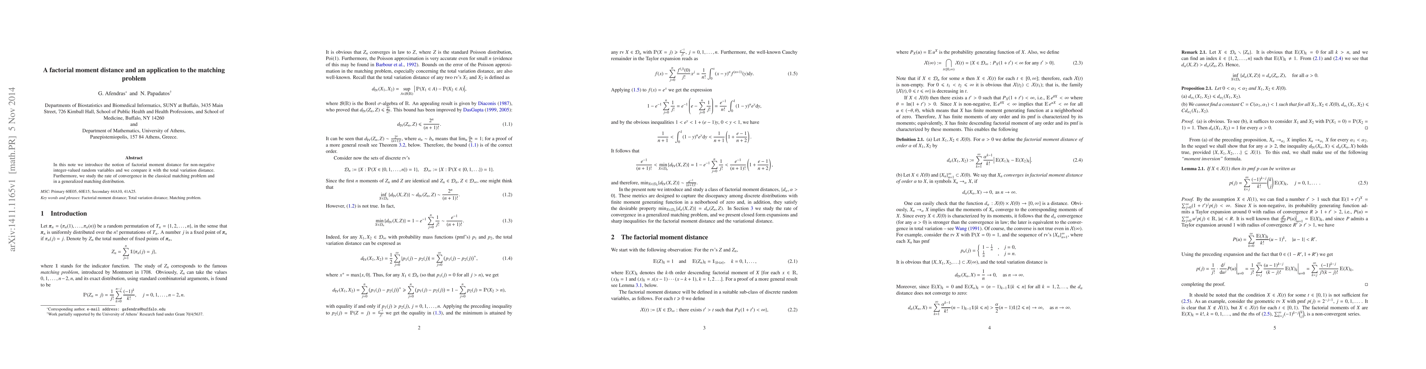 This paper introduces factorial moment distance as a new measure for comparing non-negative integer-valued random variables, and explores its application to the matching problem, finding improved convergence rates.