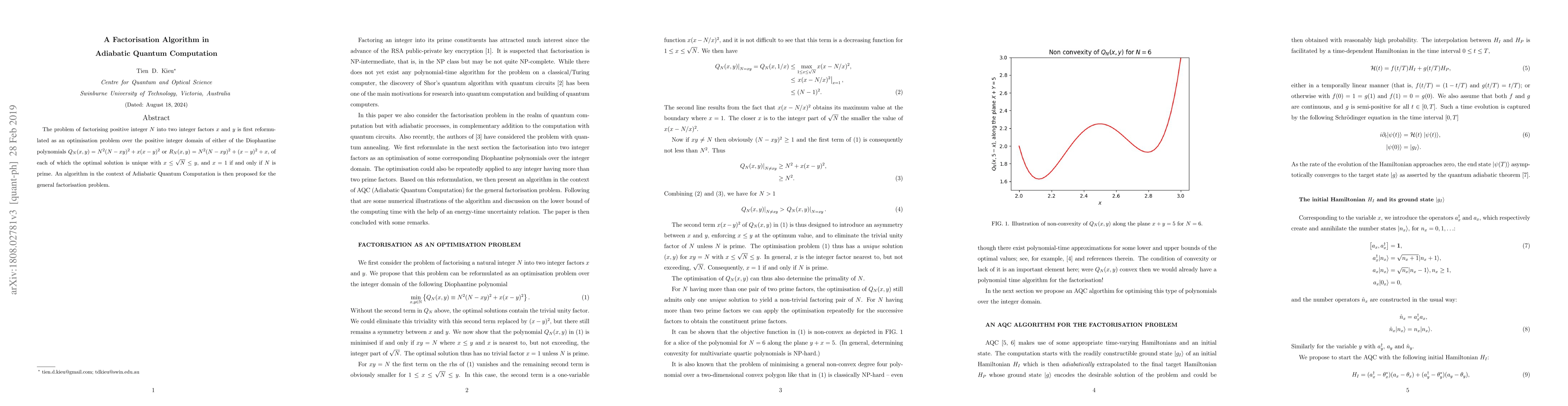 The problem of factorising positive integer $N$ into two integer factors $x$ and $y$ is first reformulated as an optimisation problem over the positive integer domain of either of the Diophantine polynomials $Q_N(x,y)=N^2(N-xy)^2 + x(x-y)^2$ or $R_N(x,y) = N^2(N-xy)^2 + (x-y)^2 + x$, of each of which the optimal solution is unique with $x\le \sqrt{N} \le y$, and $x=1$ if and only if $N$ is prime. An algorithm in the context of Adiabatic Quantum Computation is then proposed for the general factorisation problem.