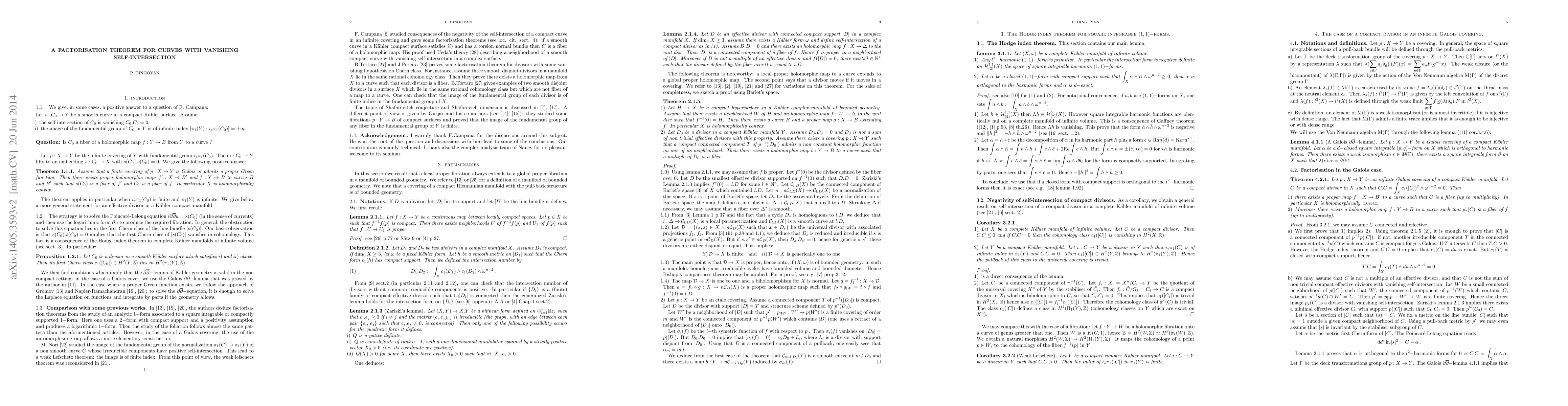 This paper investigates whether a curve C in a compact Kähler surface Y, with vanishing self-intersection and an image of infinite index in Y's fundamental group, is a fiber of a holomorphic map from Y to a curve. The authors provide a positive answer in certain cases by solving a Poincare-Lelong equation on an infinite covering of Y.