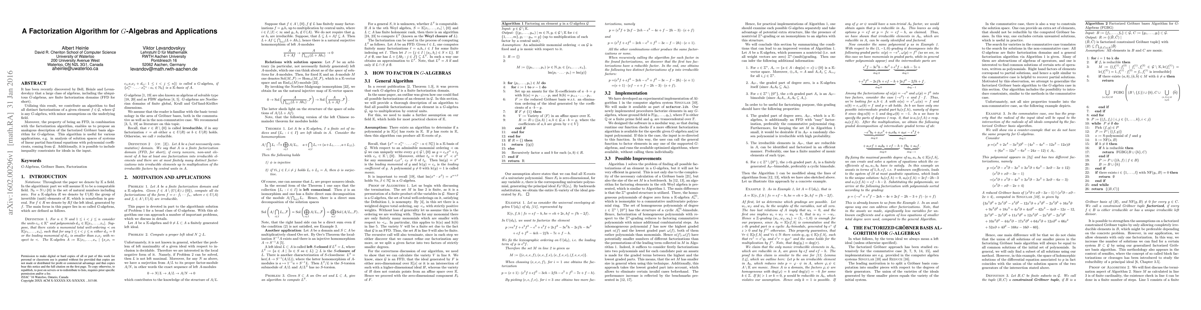 This paper presents an algorithm for finding all distinct factorizations of elements in $G$-algebras, leveraging the fact that $G$-algebras are finite factorization domains. The algorithm also facilitates a Gröbner basis algorithm for $G$-algebras, with applications in solving systems of linear partial functional equations and handling inequality constraints.