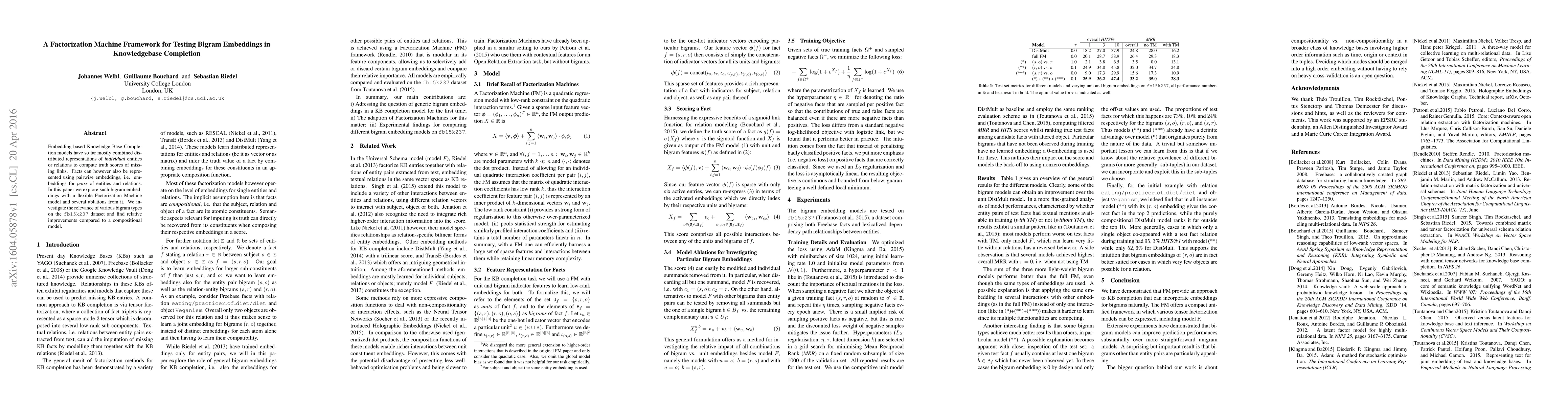 Embedding-based Knowledge Base Completion models have so far mostly combined distributed representations of individual entities or relations to compute truth scores of missing links. Facts can however also be represented using pairwise embeddings, i.e. embeddings for pairs of entities and relations. In this paper we explore such bigram embeddings with a flexible Factorization Machine model and several ablations from it. We investigate the relevance of various bigram types on the fb15k237 dataset and find relative improvements compared to a compositional model.