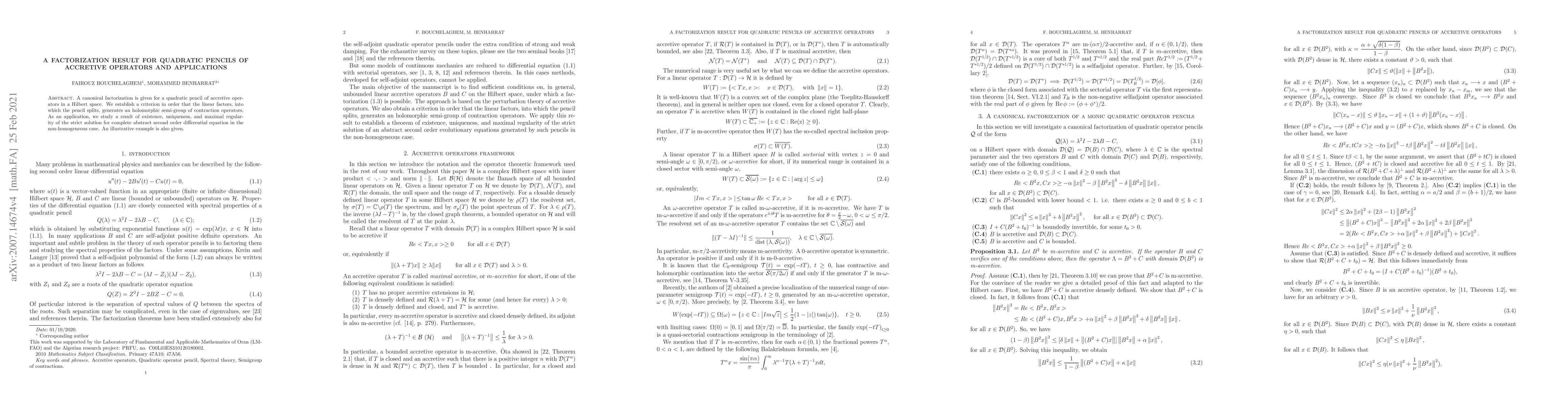 This paper presents a canonical factorization for quadratic pencils of accretive operators in Hilbert spaces and explores relationships between accretive operators and their Moore-Penrose inverses. It applies these findings to establish existence, uniqueness, and maximal regularity for strict solutions of abstract second-order differential equations.
