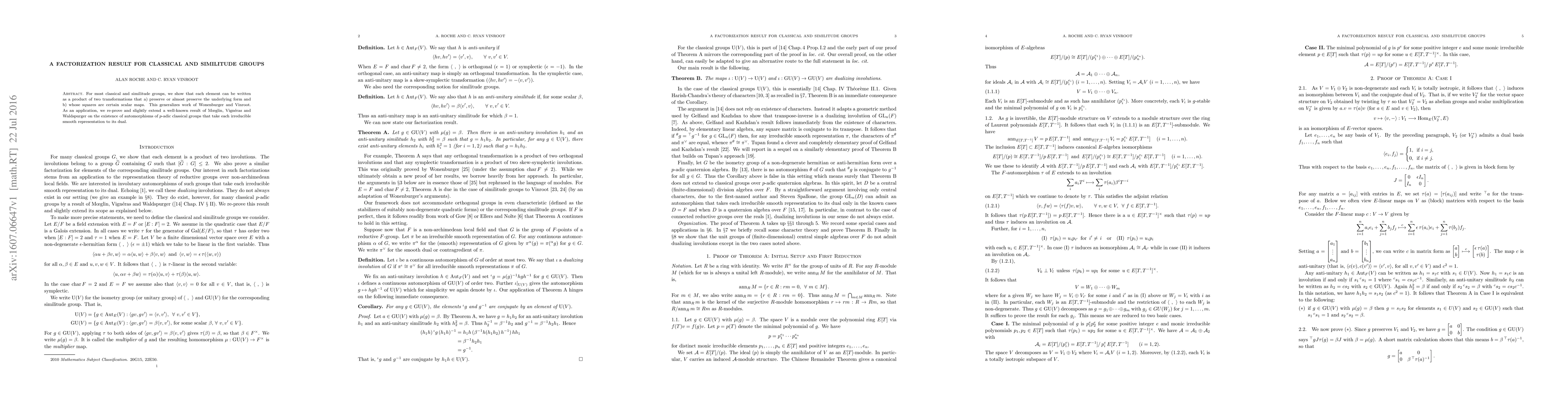 This paper demonstrates a factorization result for classical and similitude groups, showing that elements can be expressed as a product of two transformations preserving or nearly preserving the form and whose squares are scalar maps. This extends the work of Wonenburger and Vinroot and is applied to re-prove and extend a result on automorphisms of $p$-adic classical groups.