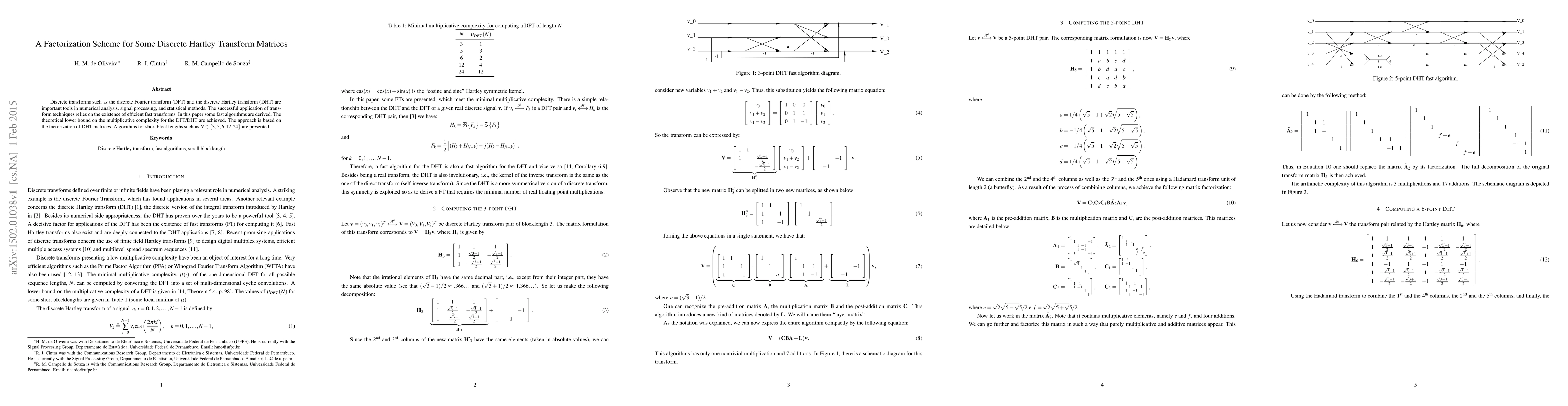 This paper develops fast algorithms for discrete Hartley transform matrices, achieving the theoretical lower bound on multiplicative complexity through matrix factorization techniques. Specific algorithms for short blocklengths, including N = 3, 5, 6, 12, and 24, are presented.