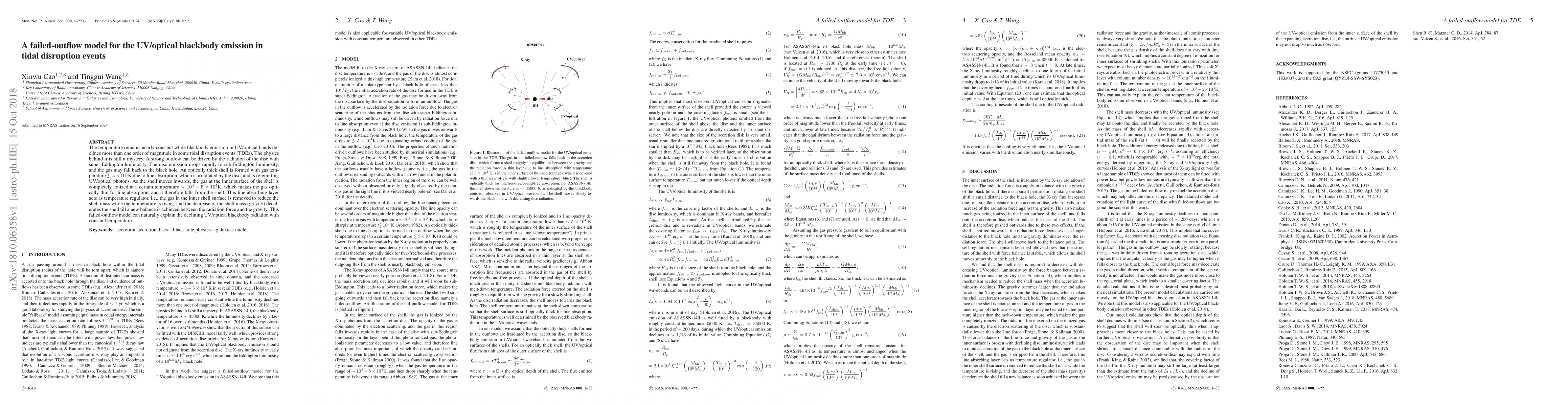 A failed-outflow model explains the decline in UV/optical blackbody radiation with constant temperature in tidal disruption events through a shell of gas that is heated, ionized, and then falls back to the black hole.