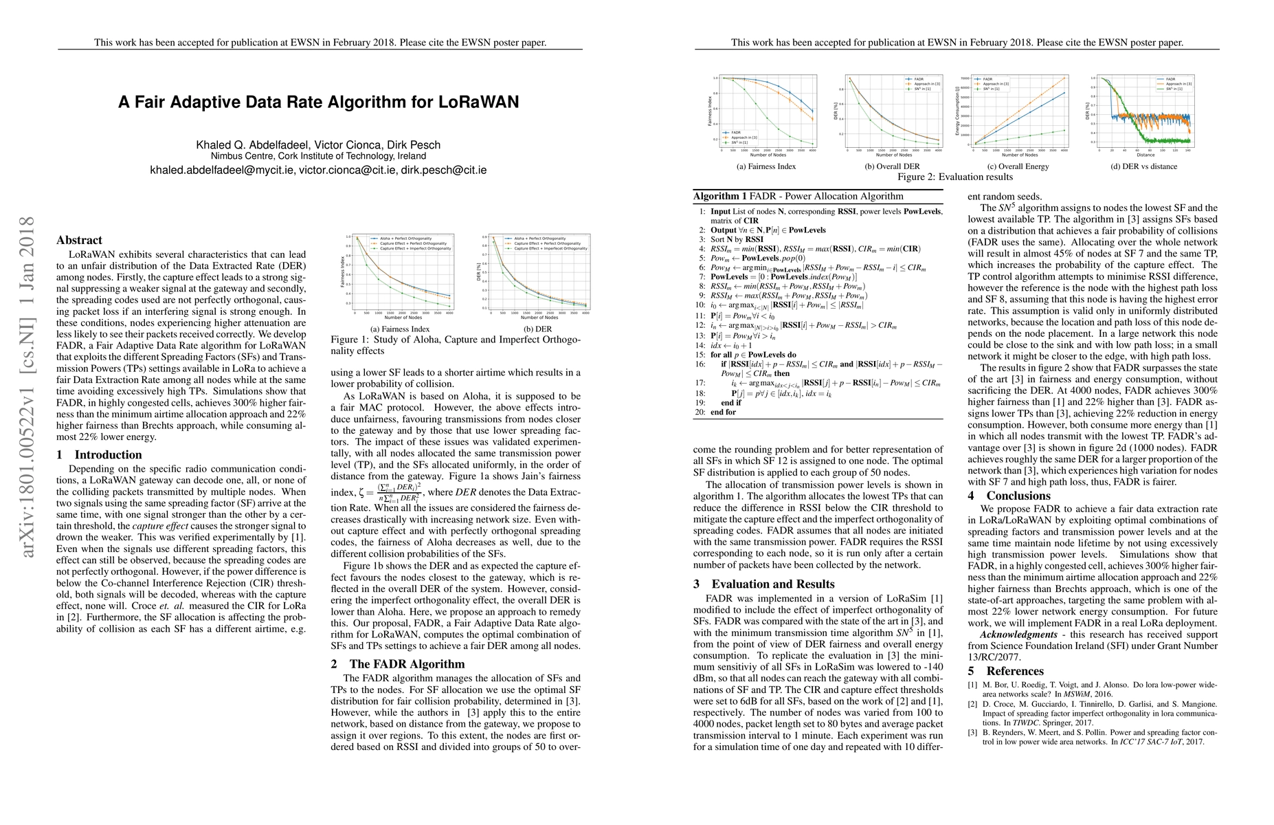 The paper proposes FADR, a Fair Adaptive Data Rate algorithm for LoRaWAN, to address the unfair DER distribution caused by signal capture and non-orthogonal spreading codes. FADR optimizes Spreading Factors and Transmission Powers to achieve fairer packet reception among nodes while reducing energy consumption.