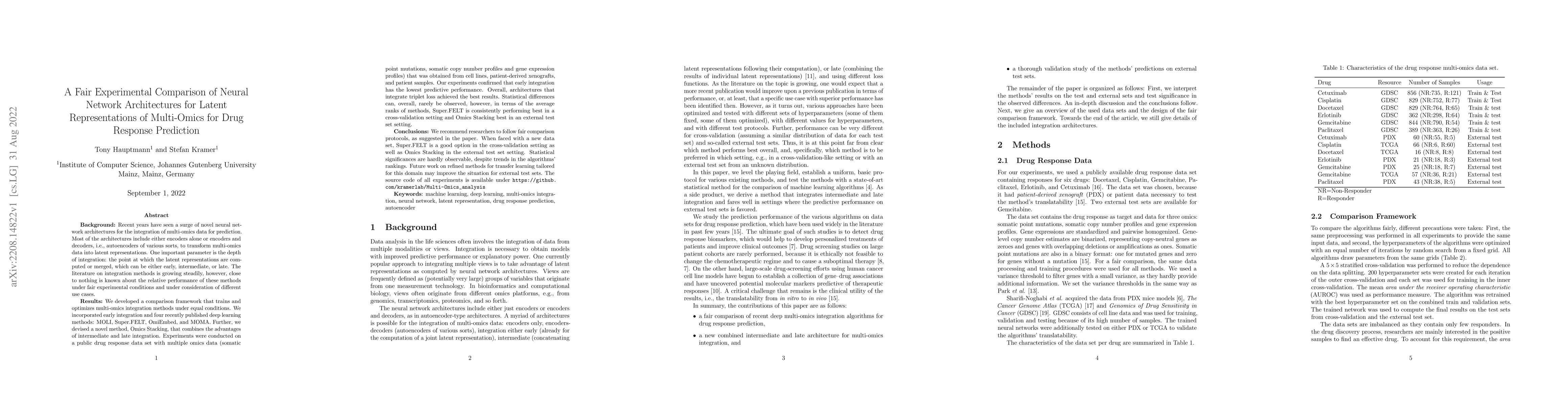 This paper compares various neural network architectures for integrating multi-omics data to predict drug response, finding that early integration methods perform the worst. Super.FELT and a novel Omics Stacking method consistently show the best performance across different evaluation settings.