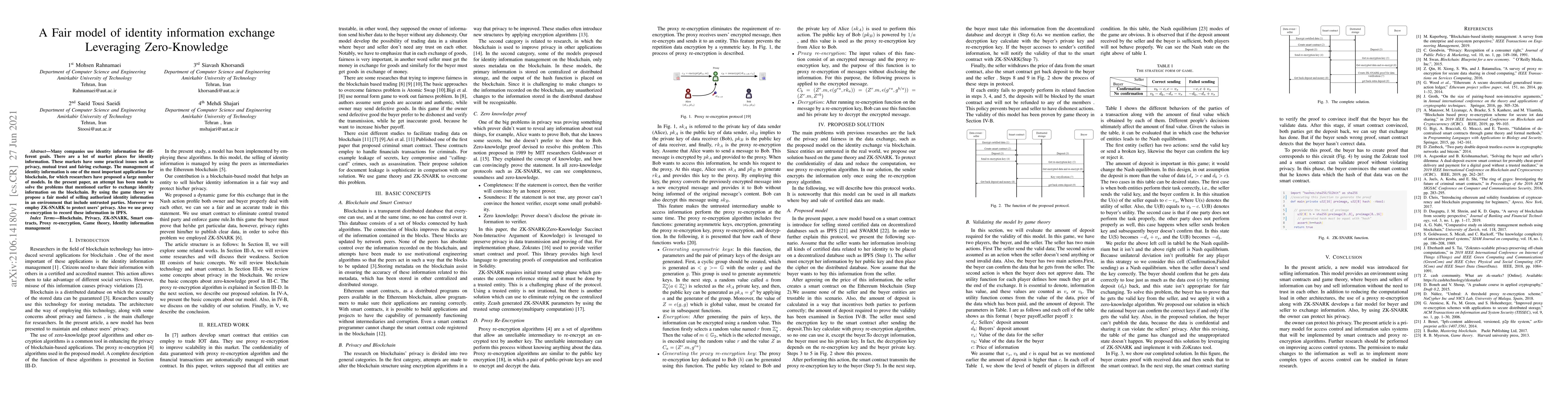 Many companies use identity information for different goals. There are a lot of marketplaces for identity information. These markets have some practical issues such as privacy, mutual trust and fairing exchange. The management of identity information is one of the most important applications for blockchain, for which researchers have proposed a large number of models. In the present paper, an attempt has been made to solve the problems that mentioned earlier to exchange identity information on the blockchain. By using the game theory we propose a fair model of selling authorized identity information in an environment that include untrusted parties. Moreover, we employ ZK-SNARK to protect users' privacy. Also, we use proxy re-encryption to record these informations in IPFS.