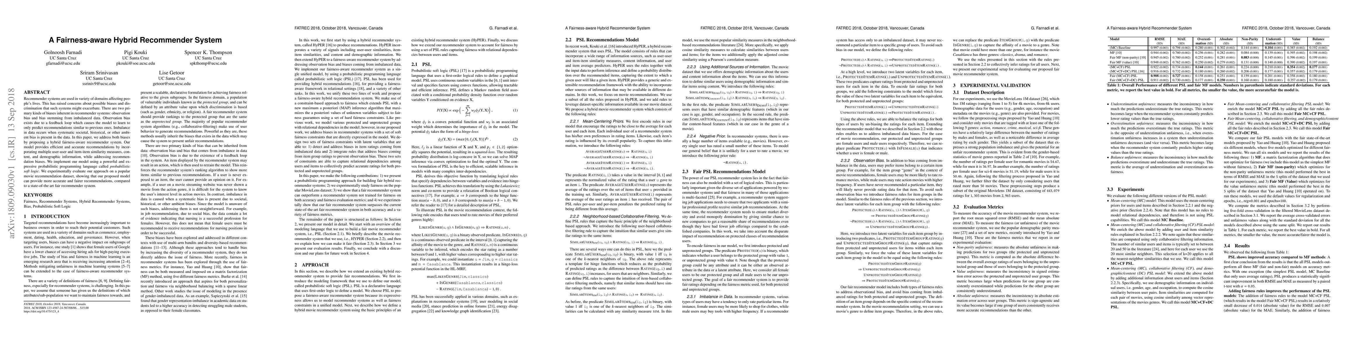 Recommender systems are used in variety of domains affecting people's lives. This has raised concerns about possible biases and discrimination that such systems might exacerbate. There are two primary kinds of biases inherent in recommender systems: observation bias and bias stemming from imbalanced data. Observation bias exists due to a feedback loop which causes the model to learn to only predict recommendations similar to previous ones. Imbalance in data occurs when systematic societal, historical, or other ambient bias is present in the data. In this paper, we address both biases by proposing a hybrid fairness-aware recommender system. Our model provides efficient and accurate recommendations by incorporating multiple user-user and item-item similarity measures, content, and demographic information, while addressing recommendation biases. We implement our model using a powerful and expressive probabilistic programming language called probabilistic soft logic. We experimentally evaluate our approach on a popular movie recommendation dataset, showing that our proposed model can provide more accurate and fairer recommendations, compared to a state-of-the art fair recommender system.