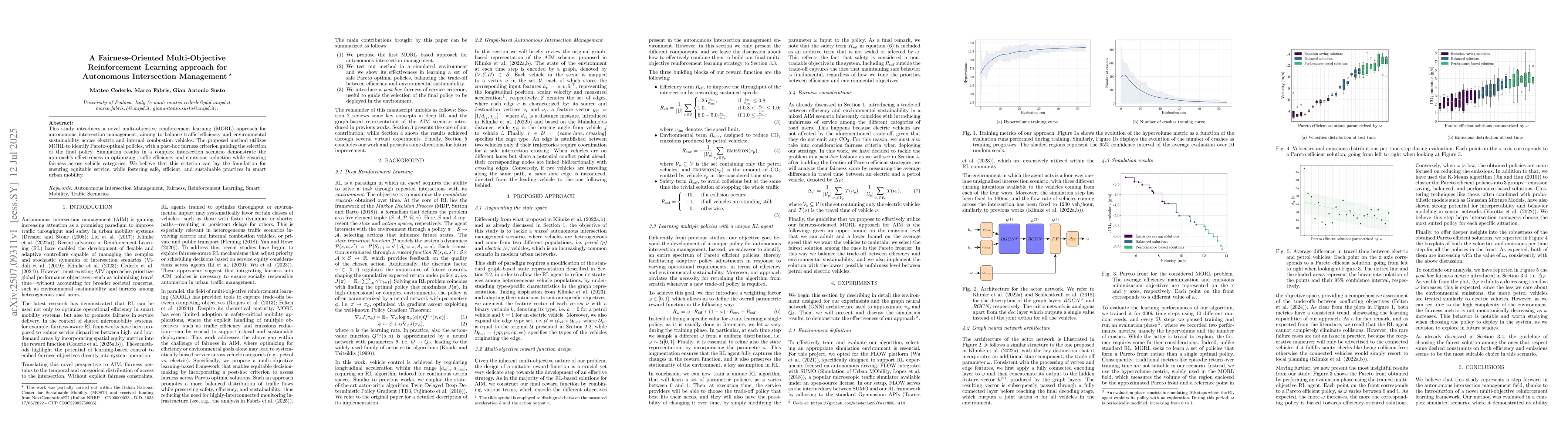 This study introduces a novel multi-objective reinforcement learning (MORL) approach for autonomous intersection management, aiming to balance traffic efficiency and environmental sustainability across electric and internal combustion vehicles. The proposed method utilizes MORL to identify Pareto-optimal policies, with a post-hoc fairness criterion guiding the selection of the final policy. Simulation results in a complex intersection scenario demonstrate the approach's effectiveness in optimizing traffic efficiency and emissions reduction while ensuring fairness across vehicle categories. We believe that this criterion can lay the foundation for ensuring equitable service, while fostering safe, efficient, and sustainable practices in smart urban mobility.