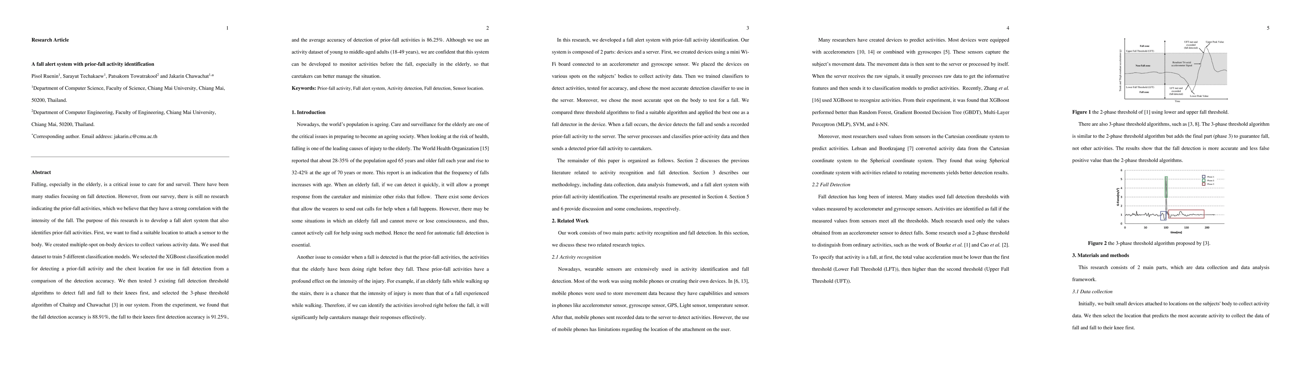 Falling, especially in the elderly, is a critical issue to care for and surveil. There have been many studies focusing on fall detection. However, from our survey, there is still no research indicating the prior-fall activities, which we believe that they have a strong correlation with the intensity of the fall. The purpose of this research is to develop a fall alert system that also identifies prior-fall activities. First, we want to find a suitable location to attach a sensor to the body. We created multiple-spot on-body devices to collect various activity data. We used that dataset to train 5 different classification models. We selected the XGBoost classification model for detecting a prior-fall activity and the chest location for use in fall detection from a comparison of the detection accuracy. We then tested 3 existing fall detection threshold algorithms to detect fall and fall to their knees first, and selected the 3-phase threshold algorithm of Chaitep and Chawachat [3] in our system. From the experiment, we found that the fall detection accuracy is 88.91%, the fall to their knees first detection accuracy is 91.25%, and the average accuracy of detection of prior-fall activities is 86.25%. Although we use an activity dataset of young to middle-aged adults (18-49 years), we are confident that this system can be developed to monitor activities before the fall, especially in the elderly, so that caretakers can better manage the situation.