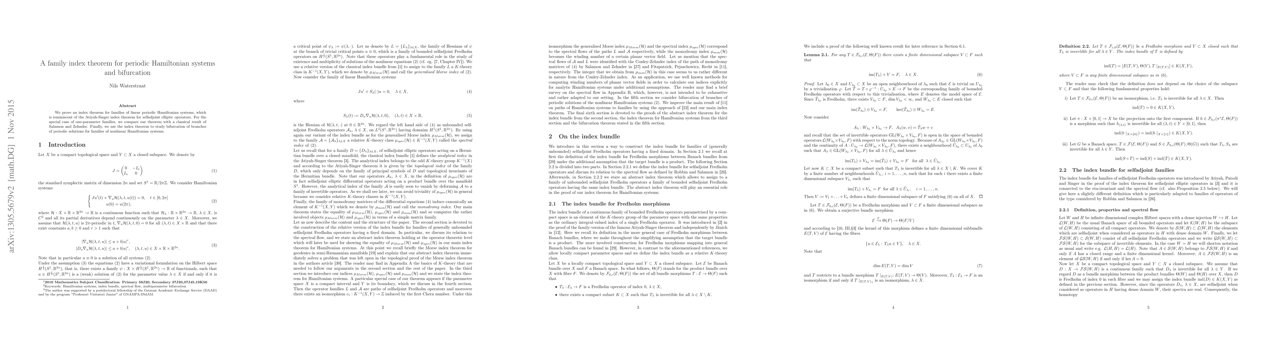 This paper proves an index theorem for linear periodic Hamiltonian systems, analogous to the Atiyah-Singer index theorem, and applies it to analyze bifurcation in nonlinear Hamiltonian systems, comparing it with a result by Salamon and Zehnder for one-parameter families.