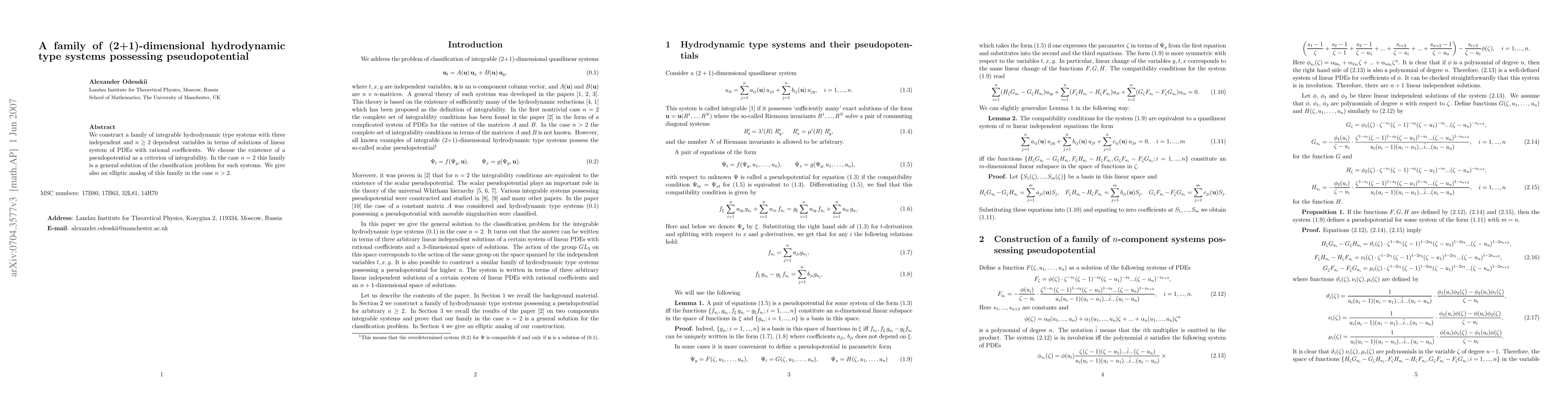 We construct a family of integrable hydrodynamic type systems with three independent and n>1 dependent variables in terms of solutions of linear system of PDEs with rational coefficients. We choose the existence of a pseudopotential as a criterion of integrability. In the case n=2 this family is a general solution of the classification problem for such systems. We give also an elliptic analog of this family in the case n>2.