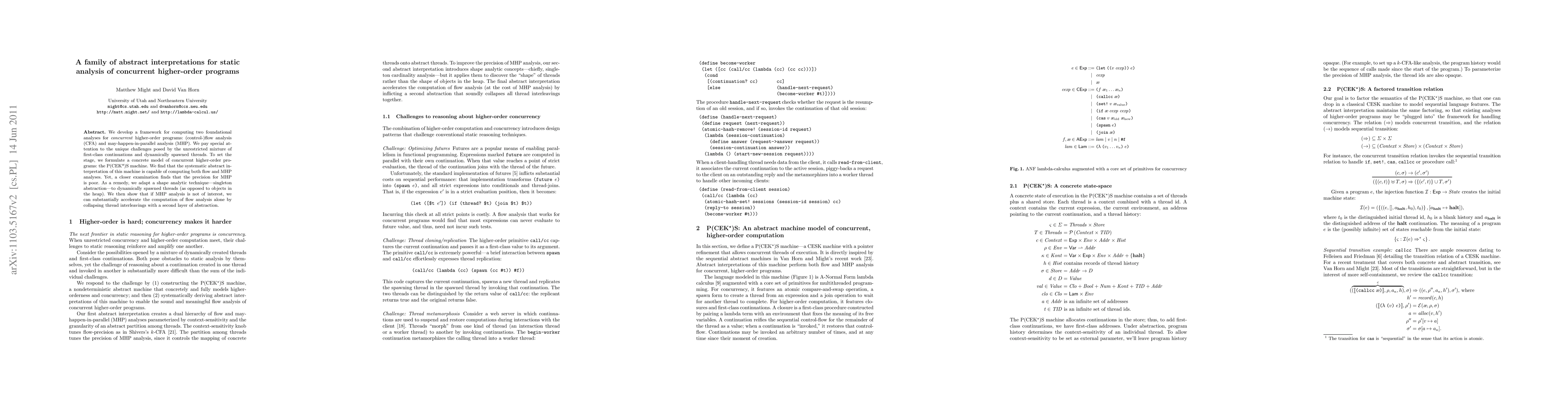 This paper develops a framework for static analysis of concurrent higher-order programs, focusing on control-flow and may-happen-in-parallel analyses. It introduces the P(CEK*)S machine model and finds that while abstract interpretation can compute both analyses, precision for may-happen-in-parallel is inadequate. To address this, the paper adapts singleton abstraction for dynamically spawned threads and shows that flow analysis can be accelerated by collapsing thread interleavings.