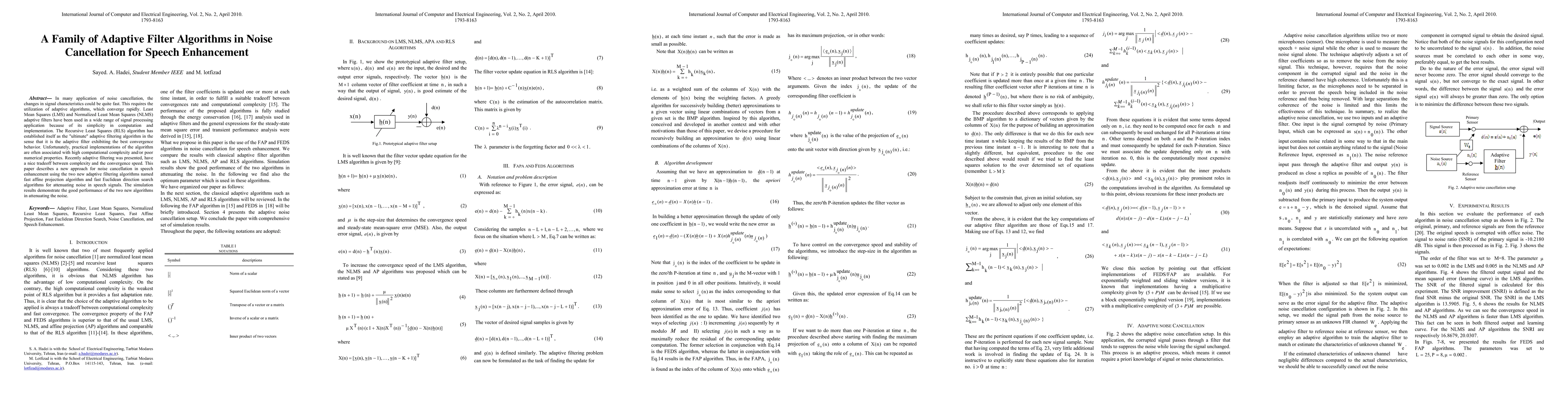 This paper introduces two new adaptive filtering algorithms—fast affine projection and fast Euclidean direction search—for noise cancellation in speech enhancement. These algorithms offer a favorable trade-off between computational complexity and convergence speed, outperforming traditional methods like LMS, NLMS, and RLS in noise attenuation.