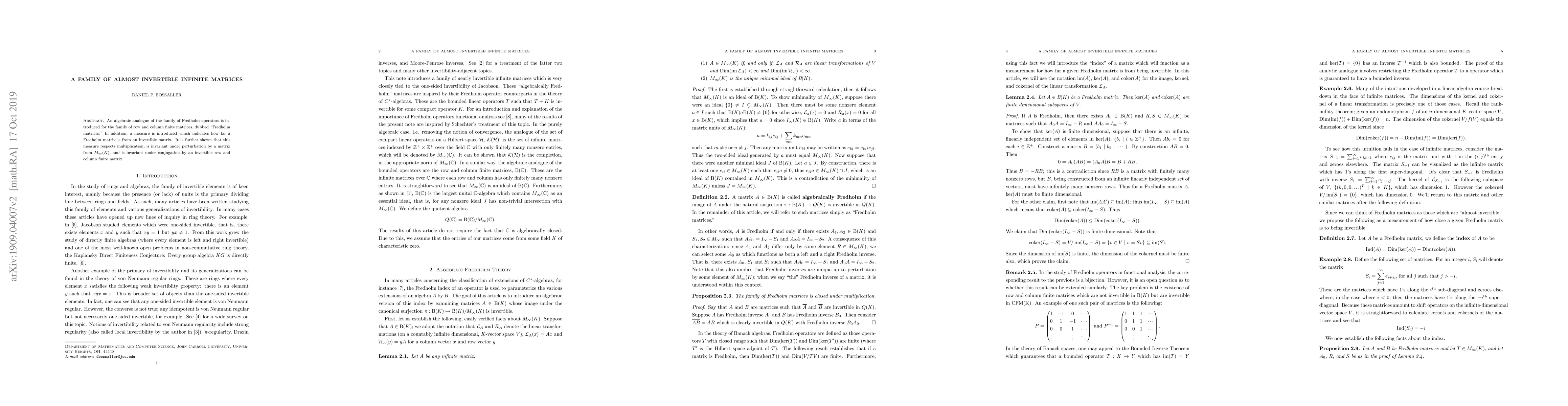 Researchers introduce a family of row and column finite matrices called Fredholm matrices, developing a measure to quantify their invertibility and showing it respects multiplication and conjugation.