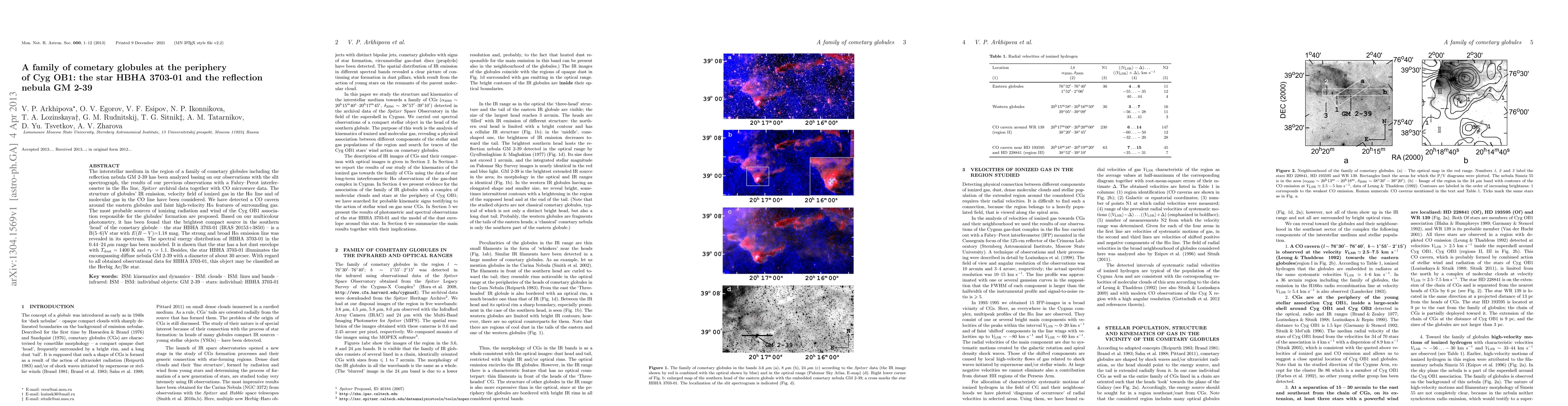 The interstellar medium in the region of a family of cometary globules including the reflection nebula GM 2-39 has been analyzed basing on our observations with the slit spectrograph, the results of our previous observations with a Fabry-Perot interferometer in the H-alpha line, Spitzer archival data together with CO microwave data. The structure of globules' IR emission, velocity field of ionized gas in the H-alpha line and of molecular gas in the CO line have been considered. We have detected a CO cavern around the eastern globules and faint high-velocity H-alpha features of surrounding gas. The most probable sources of ionizing radiation and wind of the Cyg OB1 association responsible for the globules' formation are proposed. Based on our multicolour photometry, it has been found that the brightest compact source in the southern 'head' of the cometary globule - the star HBHA 3703-01 (IRAS 20153+3850) - is a B(5-6)V star with E(B-V)=1.18 mag. The strong and broad H-alpha emission line was revealed in its spectrum. The spectral energy distribution of HBHA 3703-01 in the 0.44-24 micron range has been modeled. It is shown that the star has a hot dust envelope with T(dust)=1400 K and tau(V)=1.1. Besides, the star HBHA 3703-01 illuminates the encompassing diffuse nebula GM 2-39 with a diameter of about 30 arcsec. With regard to all obtained observational data for HBHA 3703-01, this object may be classified as the Herbig Ae/Be star.