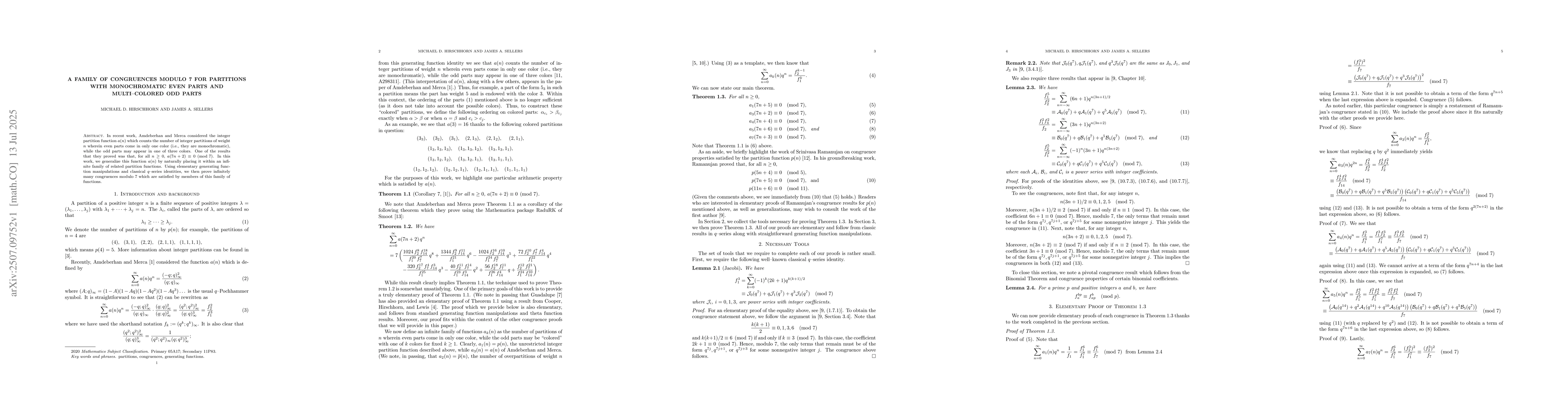 In recent work, Amdeberhan and Merca considered the integer partition function $a(n)$ which counts the number of integer partitions of weight $n$ wherein even parts come in only one color (i.e., they are monochromatic), while the odd parts may appear in one of three colors. One of the results that they proved was that, for all $n\geq 0$, $a(7n+2) \equiv 0 \pmod{7}$. In this work, we generalize this function $a(n)$ by naturally placing it within an infinite family of related partition functions. Using elementary generating function manipulations and classical $q$--series identities, we then prove infinitely many congruences modulo 7 which are satisfied by members of this family of functions.