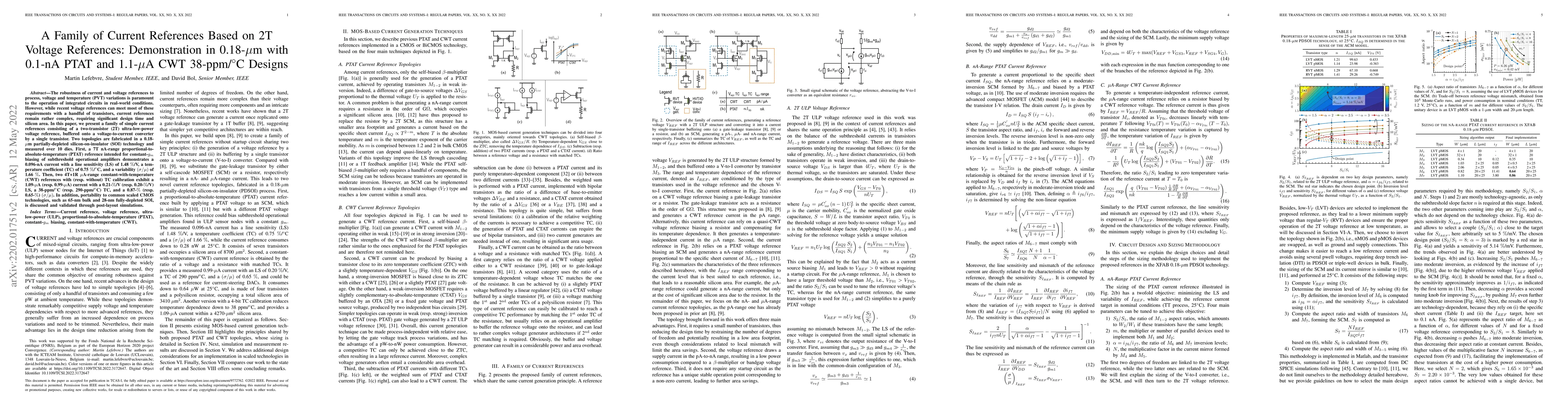 This paper introduces a family of simple, low-power current references based on a 2T voltage reference, demonstrating two designs in 0.18-$\mu$m SOI technology. The designs show robust performance with low line sensitivity, temperature coefficients, and variability, suitable for integrated circuit applications in scaled CMOS technologies.