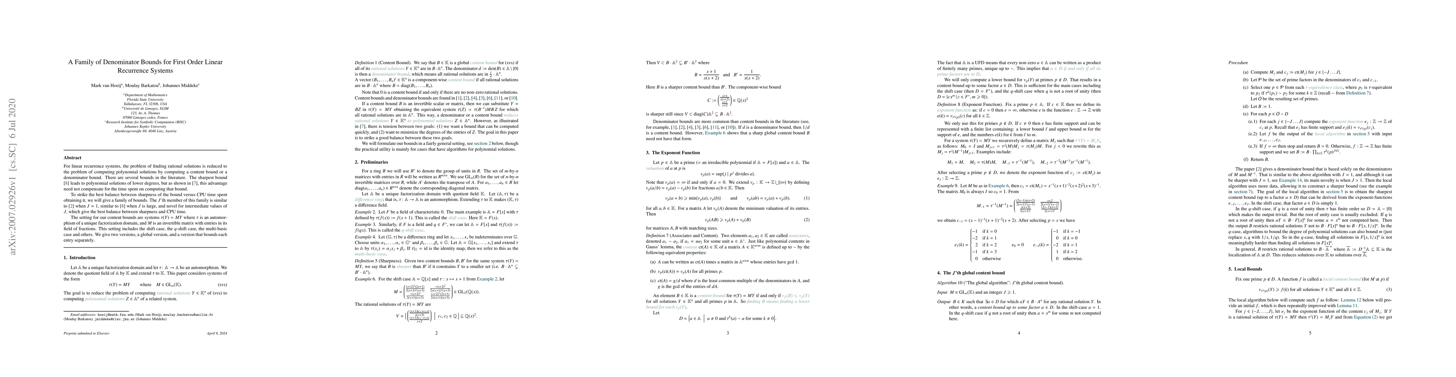 This paper presents a family of denominator bounds for first order linear recurrence systems, balancing sharpness and computational time. It caters to various settings, including shift, q-shift, and multi-basic cases, offering both global and entry-wise bounding versions.