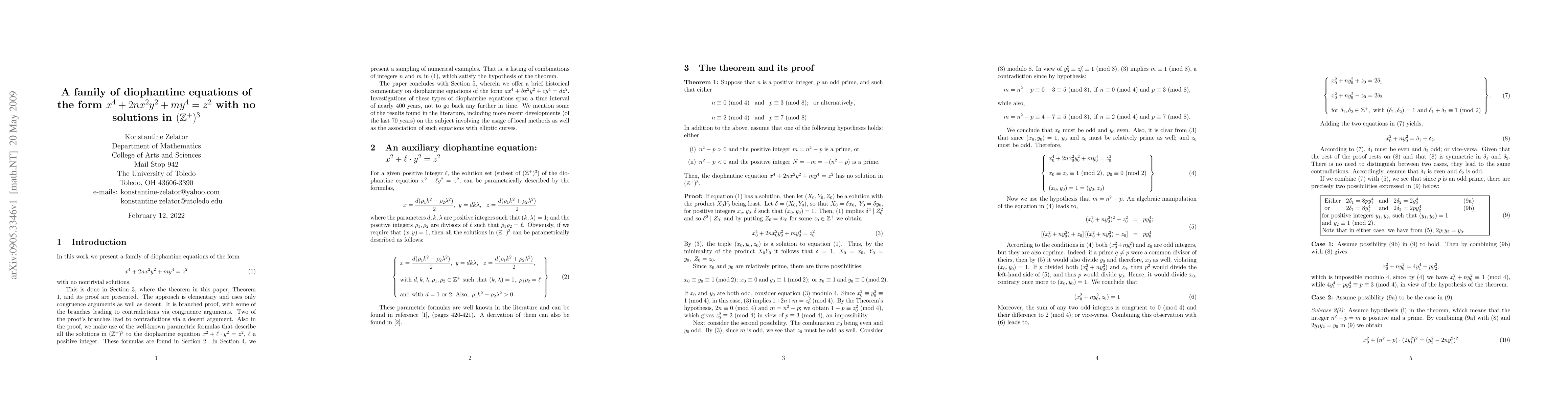 This paper proves the absence of positive integer solutions for the Diophantine equation \(x^4 + 2nx^2y^2 + my^4 = z^2\) under specific conditions on \(n\) and \(p\), using elementary methods including congruence arguments and the method of infinite descent. The proof is supplemented with 53 numerical examples and historical context.