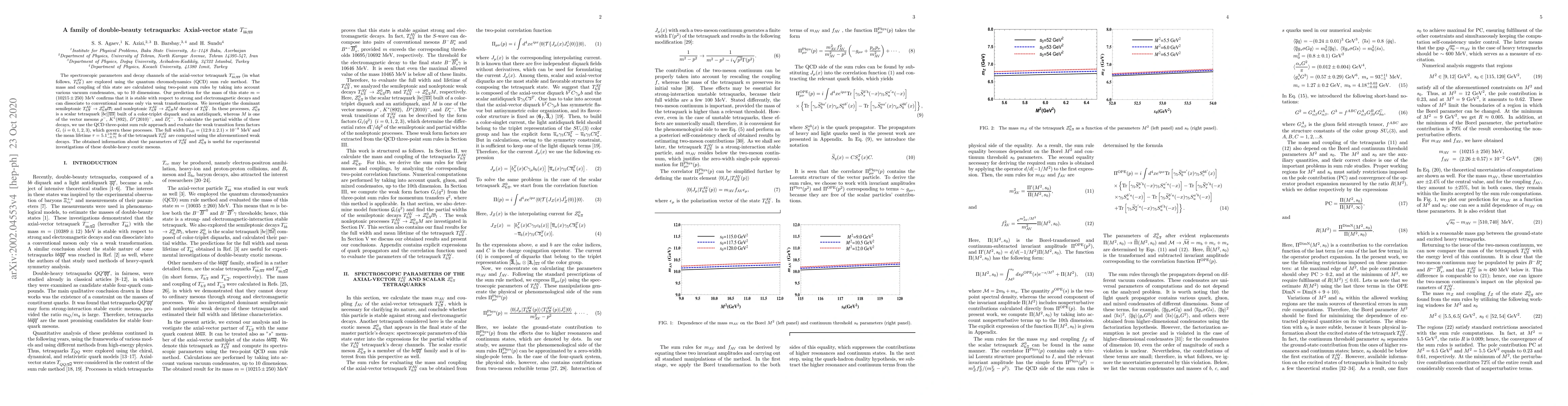The spectroscopic parameters and decay channels of the axial-vector tetraquark $T_{bb;\overline{u}\overline{s}}^{-}$ (in what follows, $T_{b: \overline{s}}^{\mathrm{AV}}$) are explored using the quantum chromodynamics (QCD) sum rule method. The mass and coupling of this state are calculated using two-point sum rules by taking into account various vacuum condensates, up to 10 dimensions. Our prediction for the mass of this state $m=(10215\pm 250)~ \mathrm{MeV}$ confirms that it is stable with respect to strong and electromagnetic decays and can dissociate to conventional mesons only via weak transformations. We investigate the dominant semileptonic $T_{b:\overline{s} }^{\mathrm{AV}} \to \mathcal{Z}_{b:\overline{s}}^{0}l\overline{\nu}_l$ and nonleptonic $T_{b:\overline{s}}^{\mathrm{AV}} \to \mathcal{Z}_{b:\overline{s} }^{0}M$ decays of $T_{b:\overline{s}}^{\mathrm{AV}}$. In these processes, $ \mathcal{Z}_{b:\overline{s}}^{0}$ is a scalar tetraquark $[bc][\overline{u} \overline{s}]$ built of a color-triplet diquark and an antidiquark, whereas $M$ is one of the vector mesons $\rho ^{-}$, $K^{\ast}(892)$, $D^{\ast }(2010)^{-}$, and $D_{s}^{\ast -}$. To calculate the partial widths of these decays, we use the QCD three-point sum rule approach and evaluate the weak transition form factors $G_{i}$ $(i=0,1,2,3)$, which govern these processes. The full width $\Gamma _{\mathrm{full}} =(12.9\pm 2.1)\times 10^{-8}~\mathrm{MeV}$ and the mean lifetime $ \tau=5.1_{-0.71}^{+0.99}~\mathrm{fs}$ of the tetraquark $T_{b:\overline{s}}^{ \mathrm{AV}}$ are computed using the aforementioned weak decays. The obtained information about the parameters of $T_{b:\overline{s}}^{\mathrm{AV}}$ and $ \mathcal{Z}_{b:\overline{s}}^{0}$ is useful for experimental investigations of these double-heavy exotic mesons.