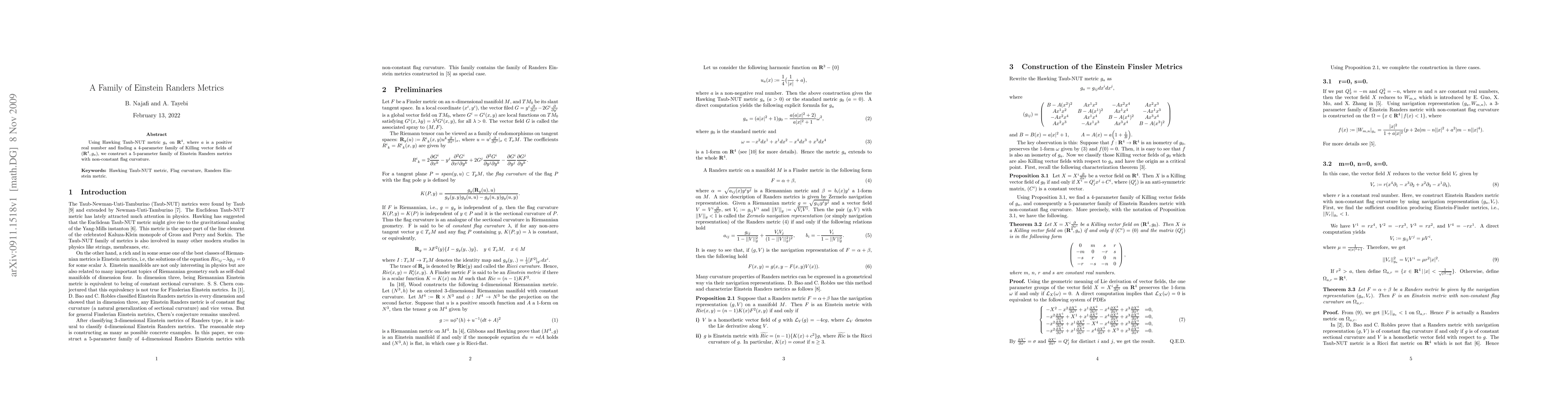 Summary: The paper constructs a 5-parameter family of Einstein Randers metrics using the Hawking Taub-NUT metric on $\mathbf{R}^4$ and identifies 4-parameter families of Killing vector fields, resulting in metrics with non-constant flag curvature.