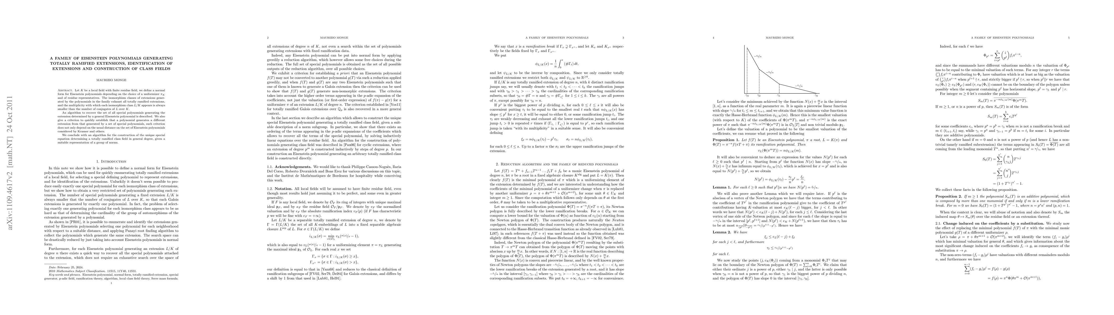Let $K$ be a local field with finite residue field, we define a normal form for Eisenstein polynomials depending on the choice of a uniformizer $\pi_K$ and of residue representatives. The isomorphism classes of extensions generated by the polynomials in the family exhaust all totally ramified extensions, and the multiplicity with which each isomorphism class $L/K$ appears is always smaller than the number of conjugates of $L$ over $K$. An algorithm to recover the set of all special polynomials generating the extension determined by a general Eisenstein polynomial is described. We also give a criterion to quickly establish that a polynomial generates a different extension from that generated by a set of special polynomials, such criterion does not only depend on the usual distance on the set of Eisenstein polynomials considered by Krasner and others. We conclude with an algorithm for the construction of the unique special equation determining a totally ramified class field in general degree, given a suitable representation of a group of norms.