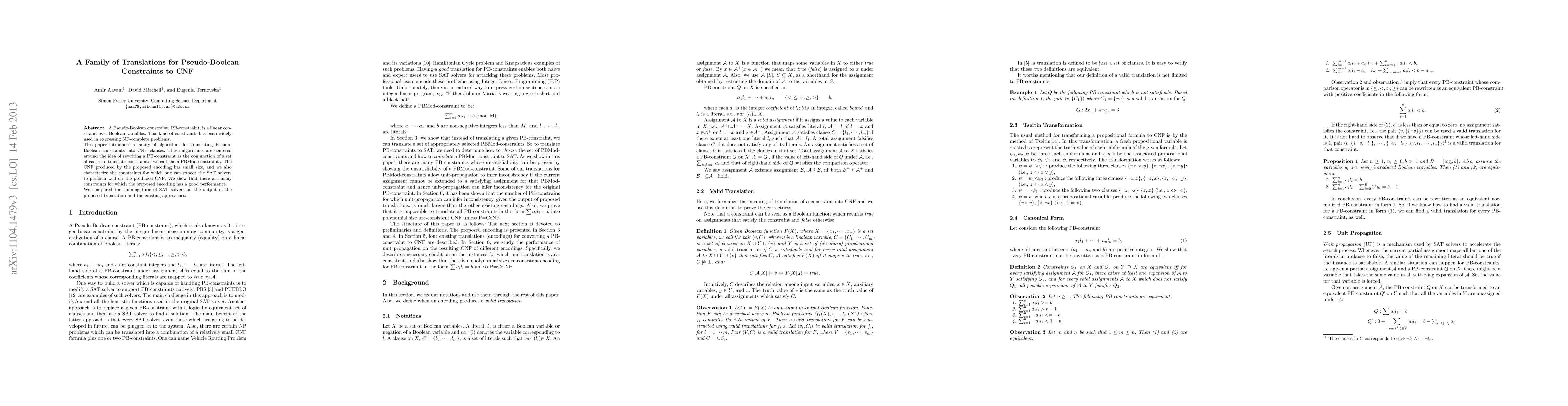 This paper presents a two-step method to translate Pseudo-Boolean constraints into CNF formulas for SAT solvers, achieving smaller CNFs and better performance in unit propagation. The method first rewrites PB constraints into PB-Mod constraints, then converts these into CNF, showing improved SAT solver performance for many types of constraints.