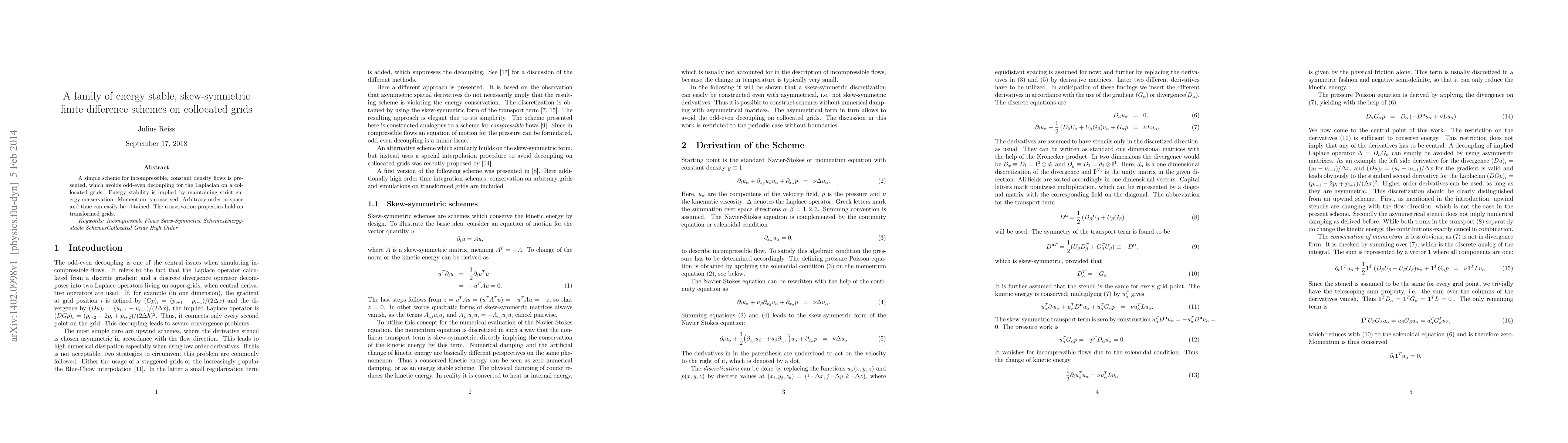 Summary: This paper introduces a family of energy stable, skew-symmetric finite difference schemes for incompressible, constant density flows on collocated grids, avoiding odd-even decoupling and maintaining strict energy conservation and momentum conservation, with arbitrary order accuracy.