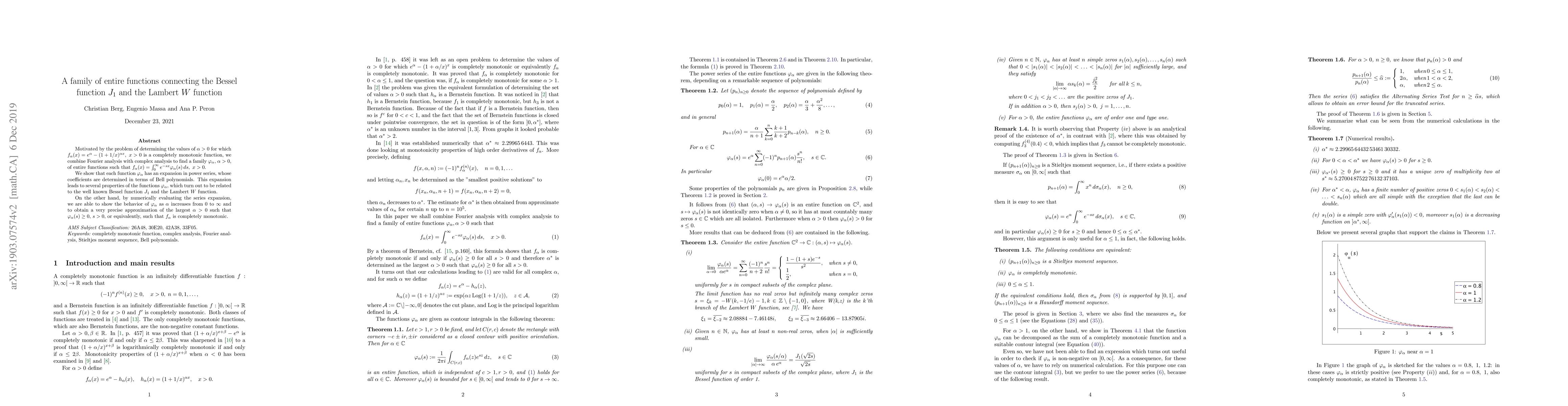 Motivated by the problem of determining the values of $\alpha>0$ for which $f_\alpha(x)=e^\alpha - (1+1/x)^{\alpha x},\ x>0$ is a completely monotonic function, we combine Fourier analysis with complex analysis to find a family $\varphi_\alpha$, $\alpha>0$, of entire functions such that $f_\alpha(x) =\int_0^\infty e^{-sx}\varphi_\alpha(s)\,ds, \ x>0.$ We show that each function $\varphi_\alpha$ has an expansion in power series, whose coefficients are determined in terms of Bell polynomials. This expansion leads to several properties of the functions $\varphi_\alpha$, which turn out to be related to the well known Bessel function $J_1$ and the Lambert $W$ function. On the other hand, by numerically evaluating the series expansion, we are able to show the behavior of $\varphi_\alpha$ as $\alpha$ increases from $0$ to $\infty$ and to obtain a very precise approximation of the largest $\alpha>0$ such that $\varphi_\alpha(s)\geq0,\, s>0$, or equivalently, such that $f_\alpha$ is completely monotonic.