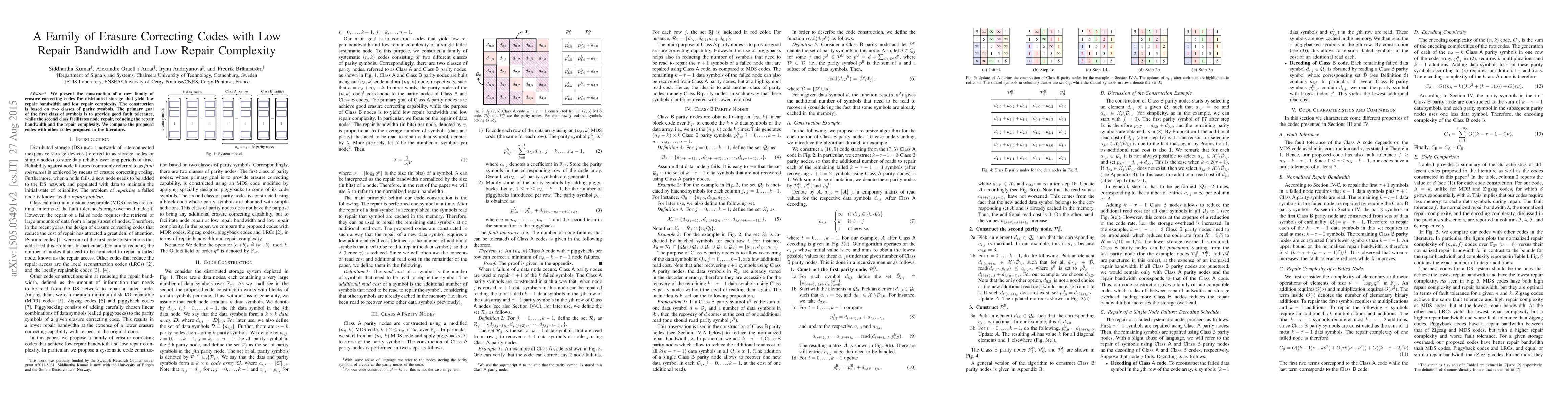 This paper introduces a new family of erasure correcting codes designed for distributed storage systems, achieving low repair bandwidth and complexity. The construction leverages two classes of parity symbols to balance error correction and efficient node repair.