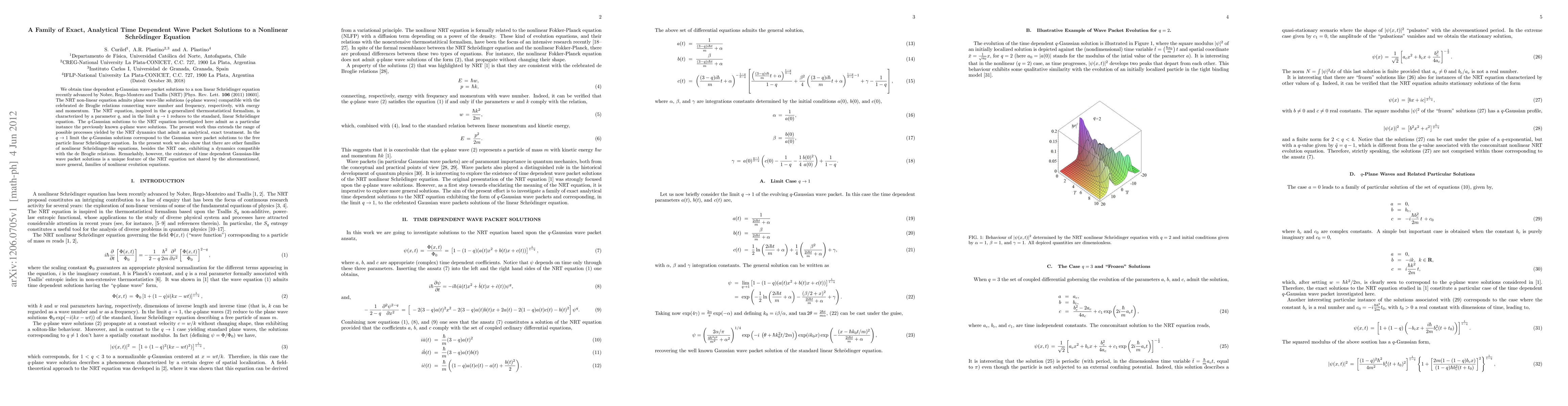 We obtain time dependent $q$-Gaussian wave-packet solutions to a non linear Schr\"odinger equation recently advanced by Nobre, Rego-Montero and Tsallis (NRT) [Phys. Rev. Lett. 106 (2011) 10601]. The NRT non-linear equation admits plane wave-like solutions ($q$-plane waves) compatible with the celebrated de Broglie relations connecting wave number and frequency, respectively, with energy and momentum. The NRT equation, inspired in the $q$-generalized thermostatistical formalism, is characterized by a parameter $q$, and in the limit $q \to 1$ reduces to the standard, linear Schr\"odinger equation. The $q$-Gaussian solutions to the NRT equation investigated here admit as a particular instance the previously known $q$-plane wave solutions. The present work thus extends the range of possible processes yielded by the NRT dynamics that admit an analytical, exact treatment. In the $q \to 1$ limit the $q$-Gaussian solutions correspond to the Gaussian wave packet solutions to the free particle linear Schr\"odinger equation. In the present work we also show that there are other families of nonlinear Schr\"odinger-like equations, besides the NRT one, exhibiting a dynamics compatible with the de Broglie relations. Remarkably, however, the existence of time dependent Gaussian-like wave packet solutions is a unique feature of the NRT equation not shared by the aforementioned, more general, families of nonlinear evolution equations.