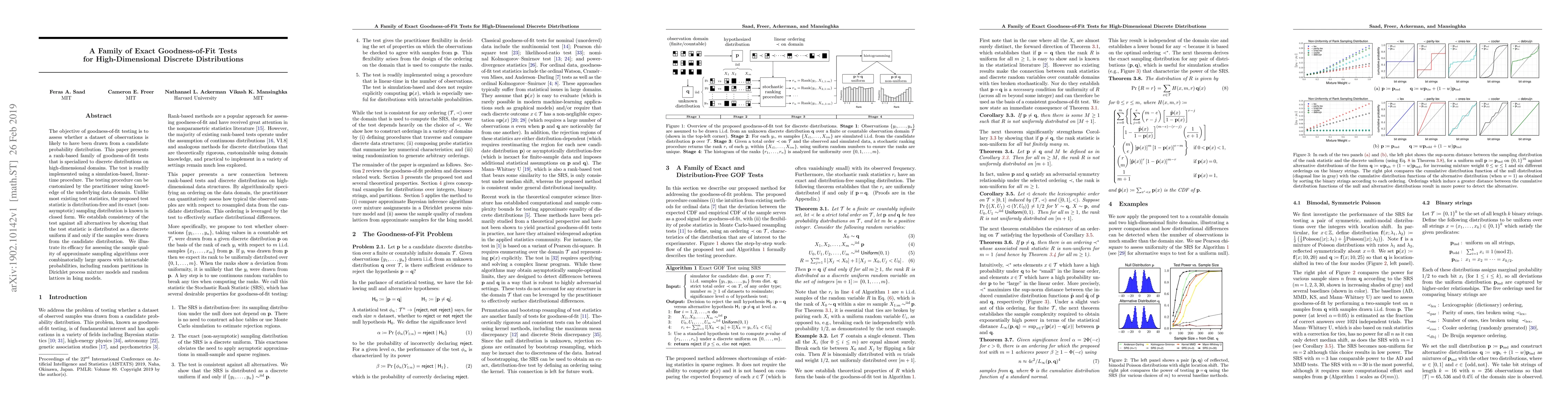 This paper introduces a family of exact, rank-based goodness-of-fit tests for high-dimensional discrete distributions, featuring a simulation-based, linear-time implementation and a distribution-free test statistic with a known exact sampling distribution. The test is shown to be consistent and effective for assessing sample quality in complex combinatorial spaces.