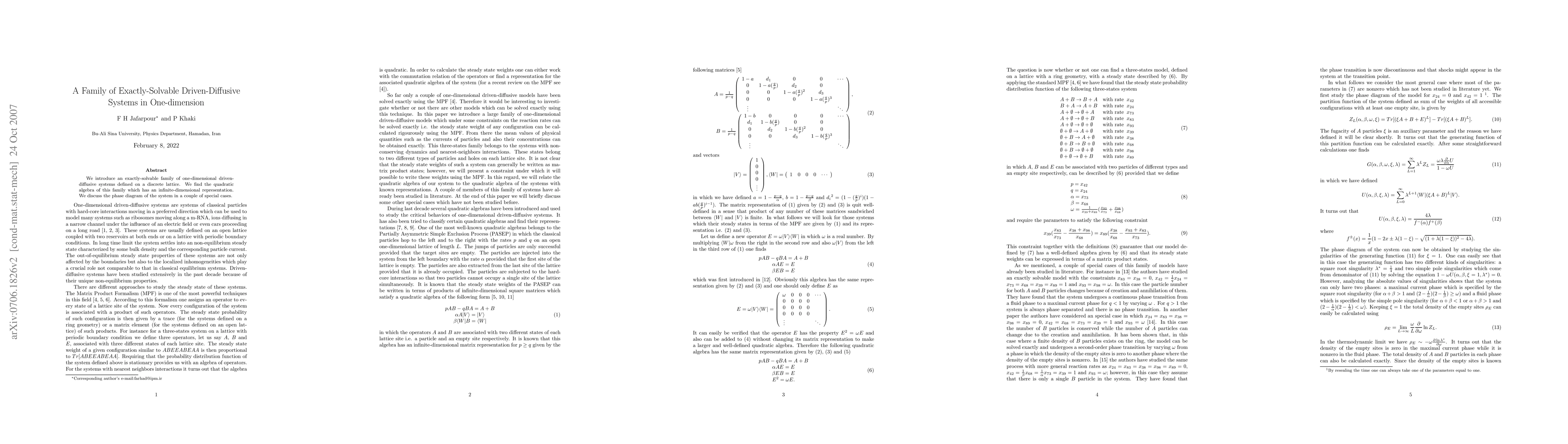 This paper presents an exactly-solvable family of one-dimensional driven-diffusive systems on a discrete lattice, revealing a quadratic algebra with an infinite-dimensional representation and analyzing the phase diagram in specific cases.
