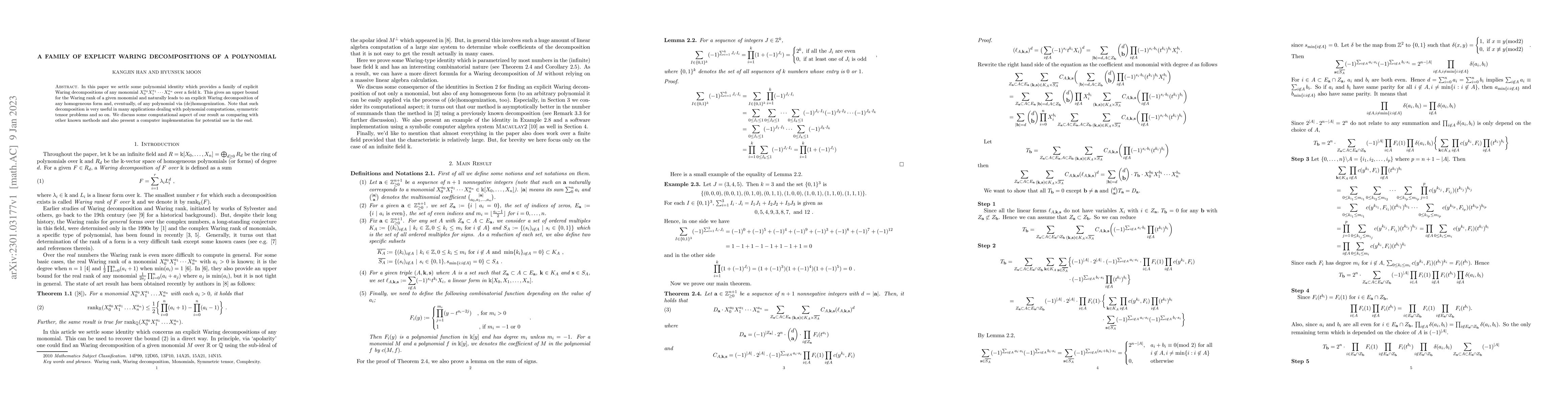 In this paper we settle some polynomial identity which provides a family of explicit Waring decompositions of any monomial $X_0^{a_0}X_1^{a_1}\cdots X_n^{a_n}$ over a field $\Bbbk$. This gives an upper bound for the Waring rank of a given monomial and naturally leads to an explicit Waring decomposition of any homogeneous form and, eventually, of any polynomial via (de)homogenization. Note that such decomposition is very useful in many applications dealing with polynomial computations, symmetric tensor problems and so on. We discuss some computational aspect of our result as comparing with other known methods and also present a computer implementation for potential use in the end.