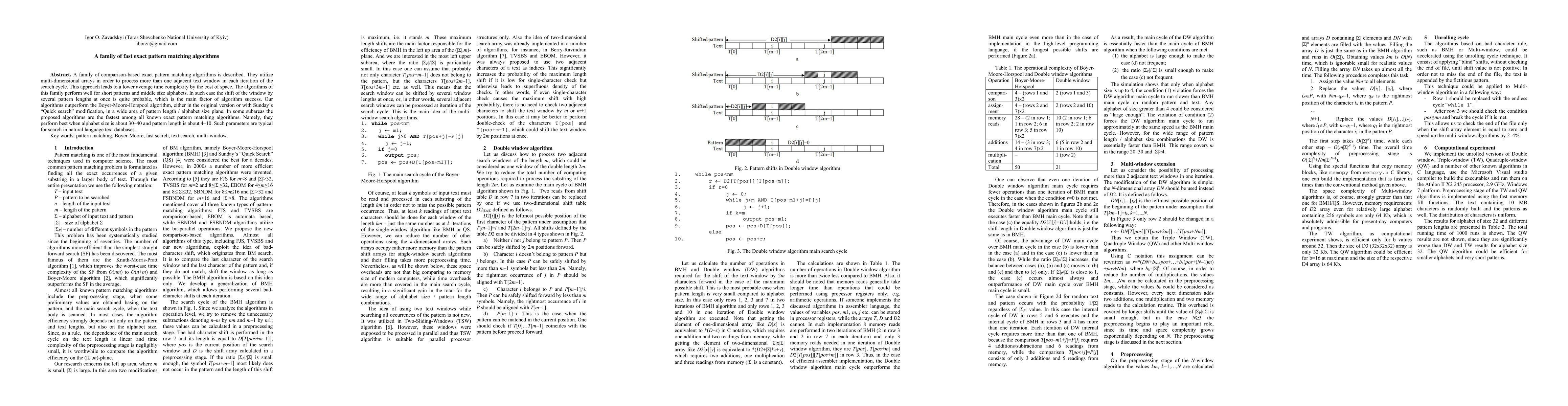This paper presents a family of fast exact pattern matching algorithms that use multi-dimensional arrays to process multiple text windows per iteration, achieving lower average time complexity at the expense of increased space. The algorithms outperform the Boyer-Moore-Horspool and its Quick search modification, especially for short patterns and medium-sized alphabets typical in natural language text databases.